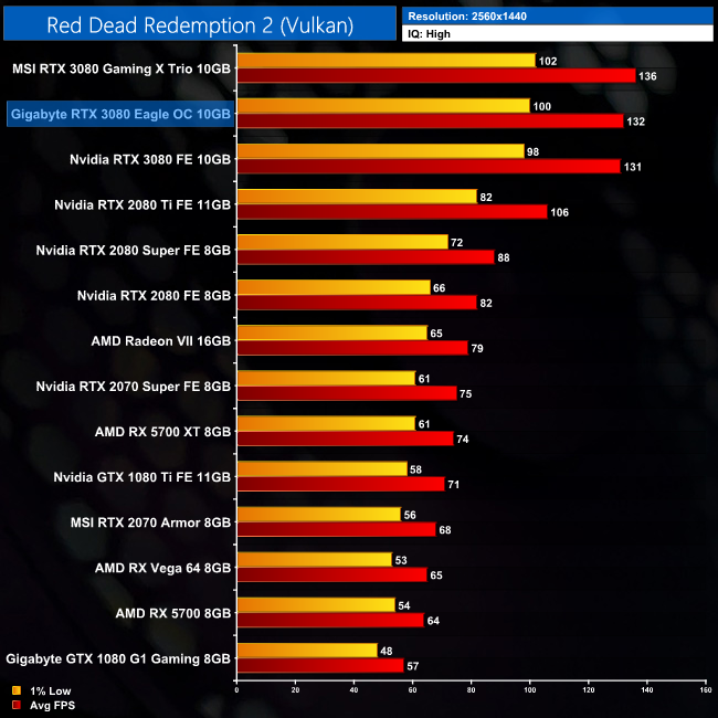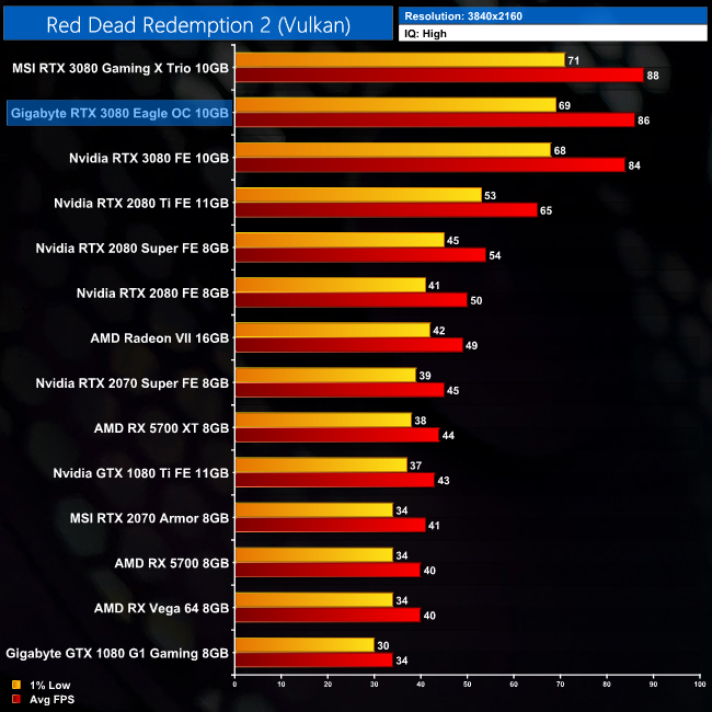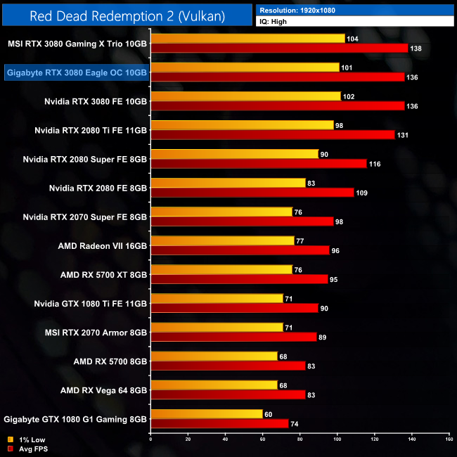 The 1080p and 1440p benchmarks for Red Dead Redemption 2 show barely any improvement for the RTX 3080 Eagle, when compared to Nvidia's 3080 design. Its best result comes at 4K, where its extra 2FPS works out as a 2% advantage over the Founders Edition.