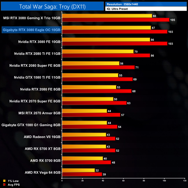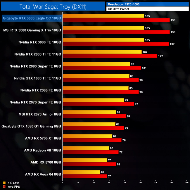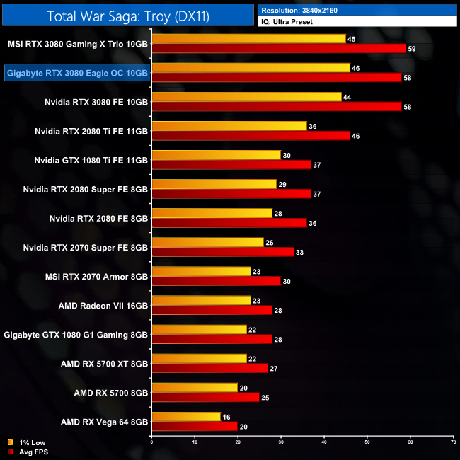Total War Saga: Troy is our last game of the day, and it represents a worst-case scenario for gaming with the Gigabyte Eagle, as it registers effectively no improvement over the Founders Edition. The average frame rates of the two cards are identical at 1080p and 1440p, while the Gigabyte edges ahead by a single frame at 4K.