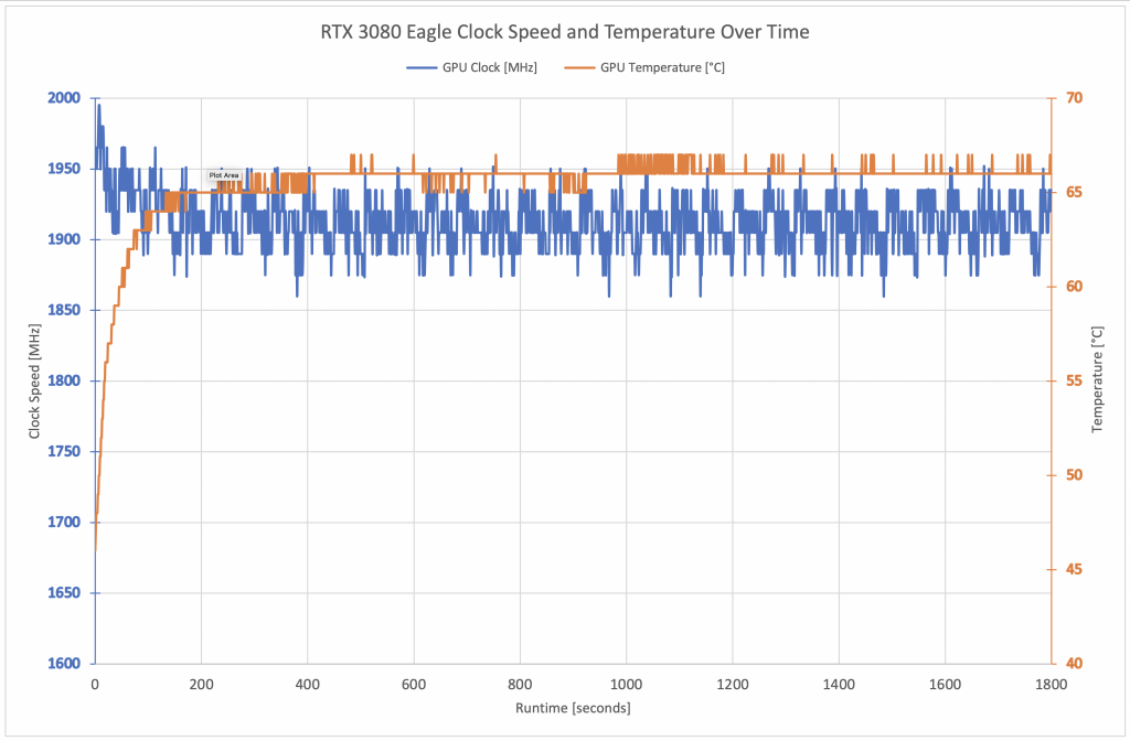 With a rated boost clock of 1755MHz, the Eagle should be about 45MHz faster than the Founders Edition. In fact, it does slightly better than this, recording an average frequency of 1913MHz across our 30 minute Time Spy stress test. This works out at 57MHz faster, on average, than the Founders Edition.