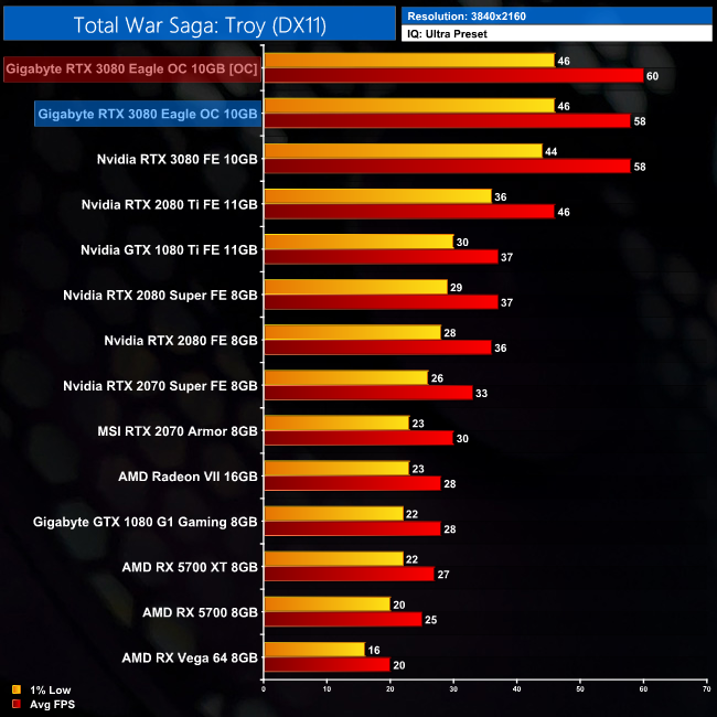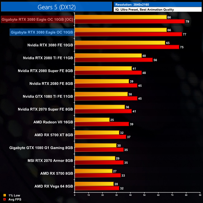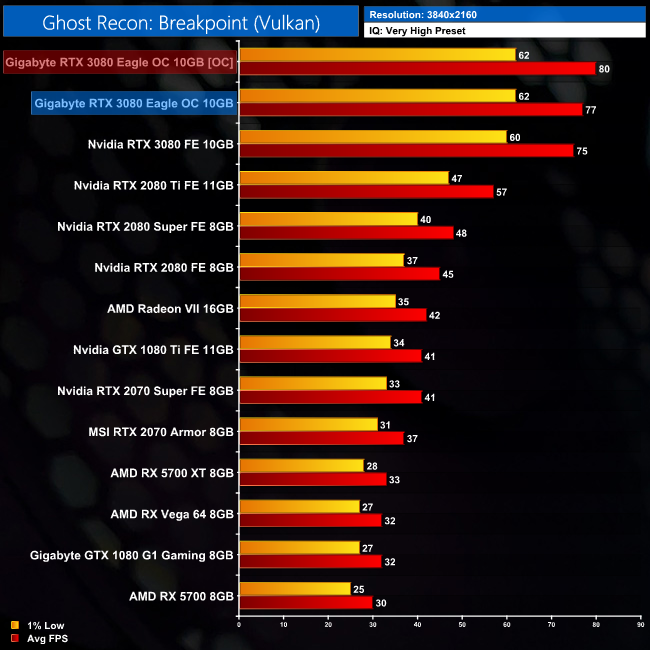 This wasn't much of an overclock at all, so it's not surprising to see the RTX 3080 Eagle only running 3-4% faster with the additional frequency. Once more, it does seem there is simply very little performance headroom left to tap into for Ampere, when it comes to overclocking.