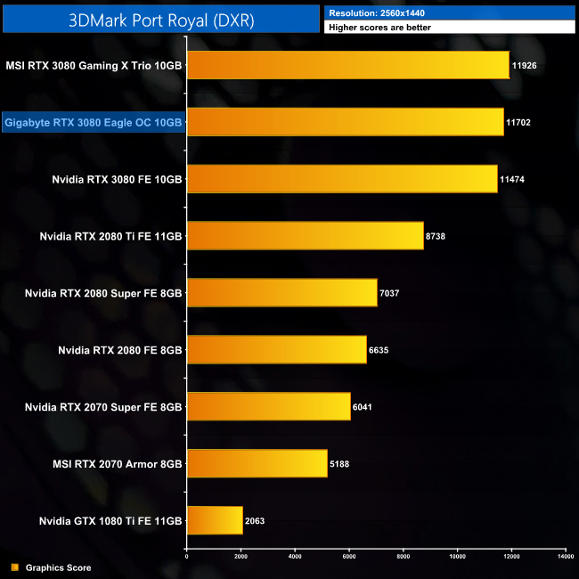 Just like 3DMark Time Spy, Port Royal sees the RTX 3080 Eagle improve on Nvidia's Founders Edition by 2%.