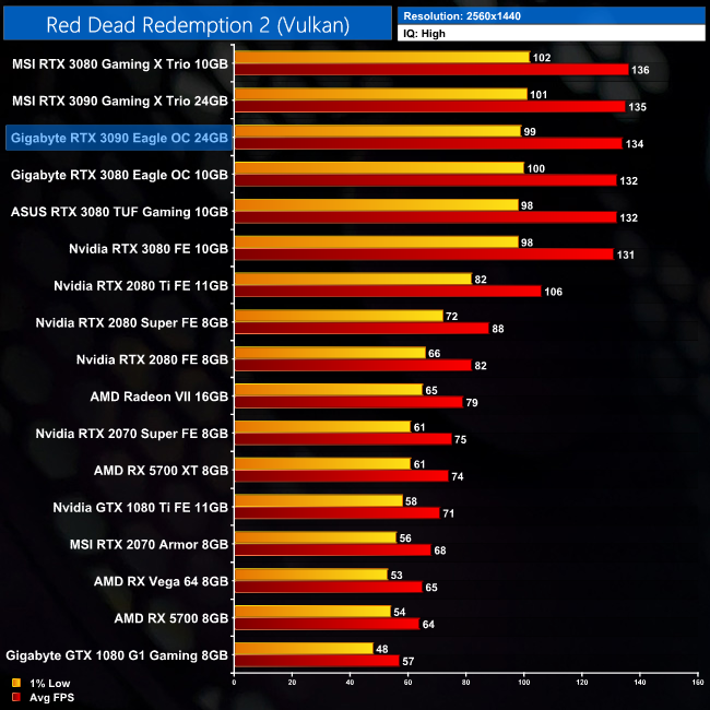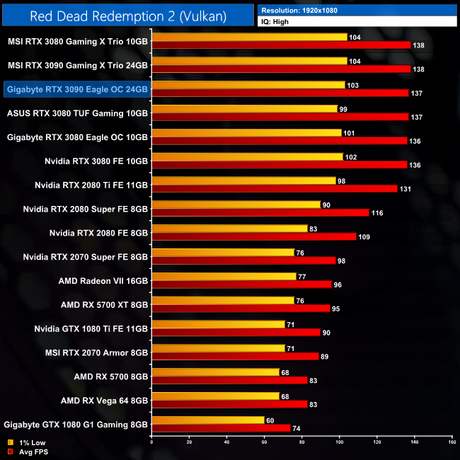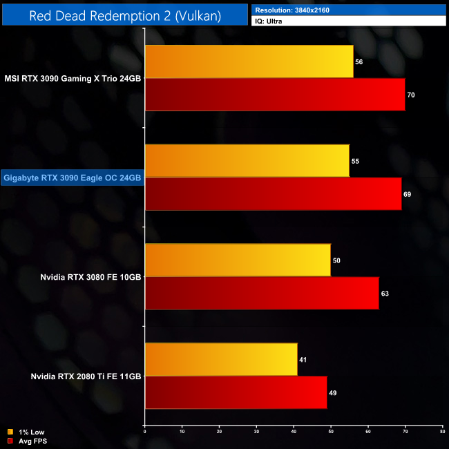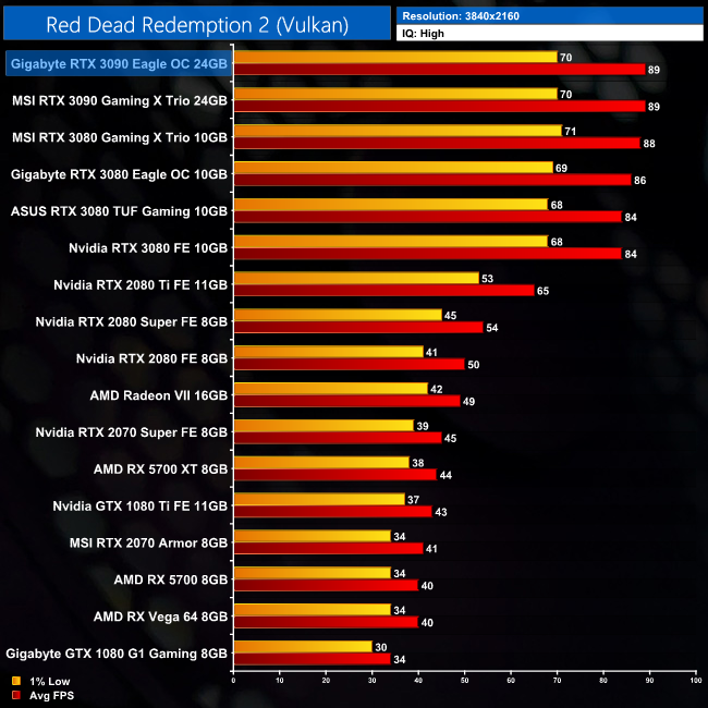Read Dead Redemption 2 brought about some interesting results. It would seem at 4K, using High settings, the RTX 3090 is limited by something other than its GPU horsepower – here it's just 6% faster than the RTX 3080 Founders Edition, while this gap is even smaller when compared to some of the factory overclocked RTX 3080s we have tested.
