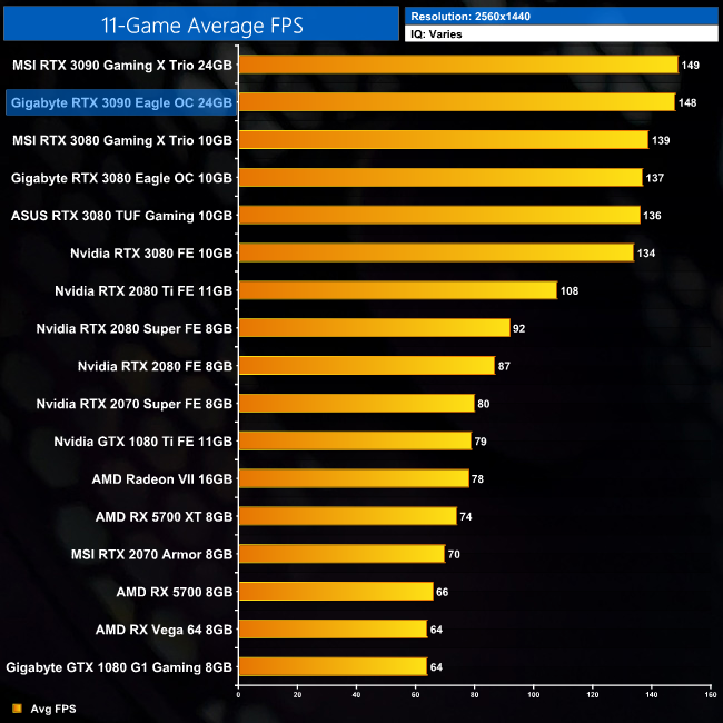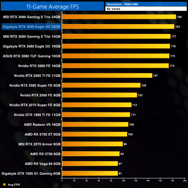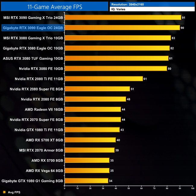 Users will get the most out of the RTX 3090 at 4K, of that there is no doubt. In fact, numerous titles that we tested today would benefit from a high refresh rate 4K monitor, as exemplified by the 4K average frame rate coming in at 90FPS. At 4K, the RTX 3090 Eagle is on average 13% faster than the RTX 3080 Founders Edition, and 48% faster than the RTX 2080 Ti.
