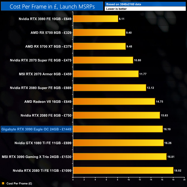 Overall value of the RTX 3090 is poor, of that there is no doubt – RTX 3080 is almost half as cheap in terms of its cost per frame. The irony is that, even at a price close to £1500, the GPU still delivers better value than the RTX 2080 Ti.