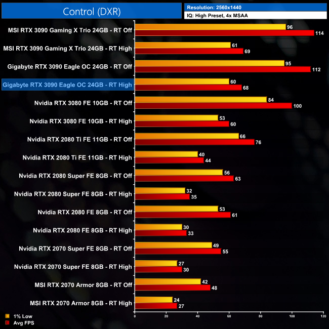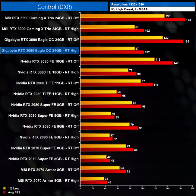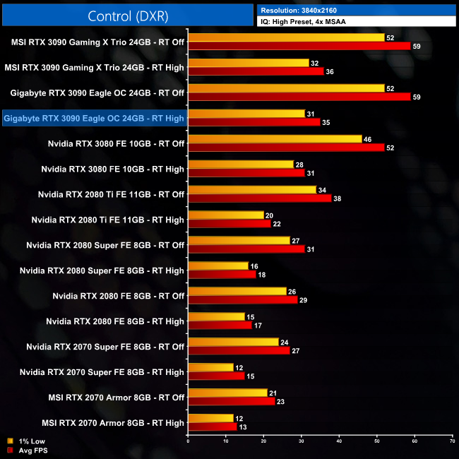Looking at Control, cranking the RT settings to High in this game reduces frame rates to just over 30FPS at 4K. However, it is the margins we are interested in, and these don't change here, as the RTX 3090 Eagle is still 13% faster than the RTX 3080 Founders Edition. I had wondered if the 3090's extra RT cores would give it a bigger boost, relatively speaking, but that is not the case for Control.