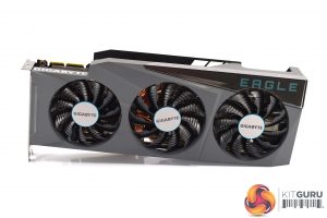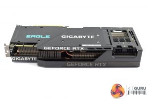 For the graphics card itself, as we alluded to on the first page, this is the exact same cooler and shroud as per the RTX 3080 Eagle OC. This means the card uses a relatively stripped-back design, with a mostly grey plastic shroud. We can also note the translucent area which is home to the Eagle brand name.