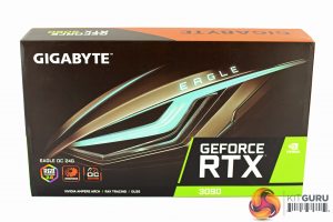 The Gigabyte RTX 3090 Eagle OC ships in a dark box, with the Eagle logo and branding visible on the front.