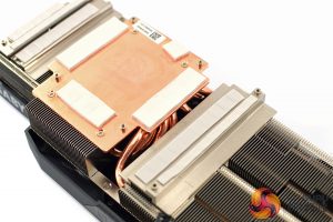 Lastly, the Eagle OC's cooler is unchanged compared to the RTX 3080 model. That means it uses two fin stacks, with a total of 7x 6mm copper heatpipes. The GPU contacts directly with a copper plate, as do the memory modules (via thermal pads). Smaller plates are also used to contact with the VRM and MOSFETs, again via thermal pads.