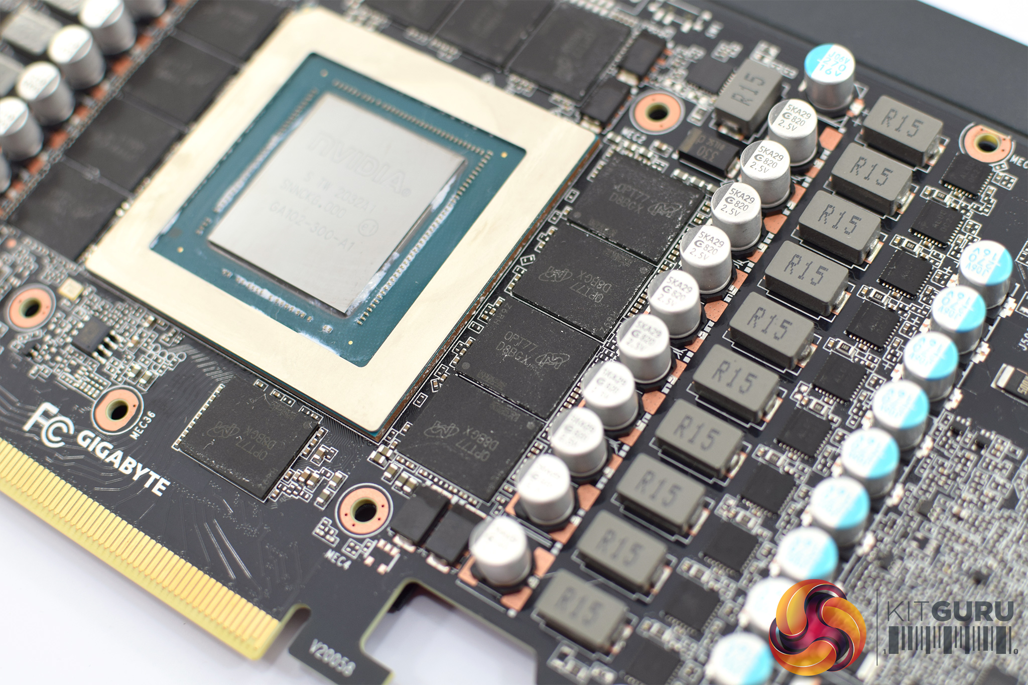 In terms of its PCB, here we can note some differences compared to the RTX 3080 Eagle OC. The overall design is the same, but the power delivery has been beefed up to a 15+4 configuration. The RTX 3080 Eagle OC uses a 13+4 VRM.