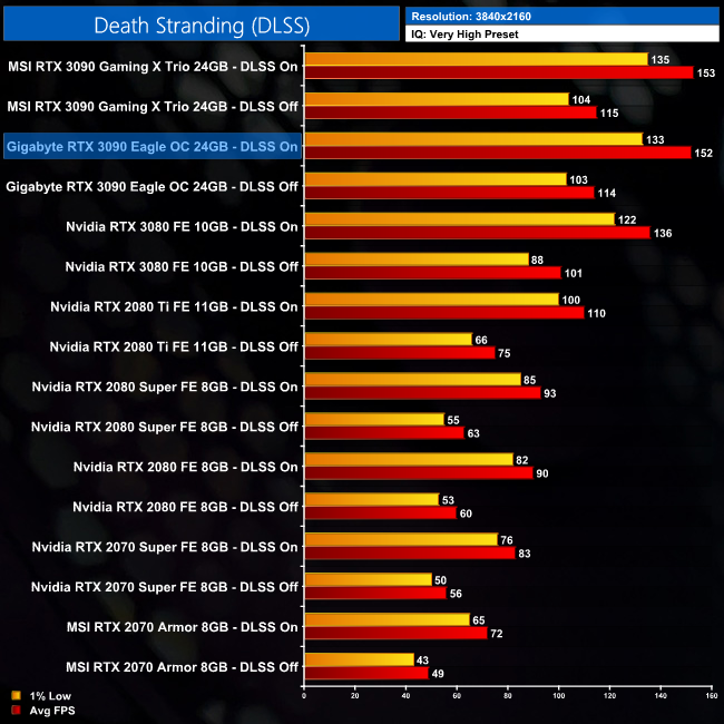 In Death Stranding, even at 4K the frame rates are pretty high, and we see diminishing returns from DLSS as a result of this. RTX 3090 still gets a 33% boost to its frame rate, but this is actually less than the RTX 2080 Ti, which sees a 47% uplift.