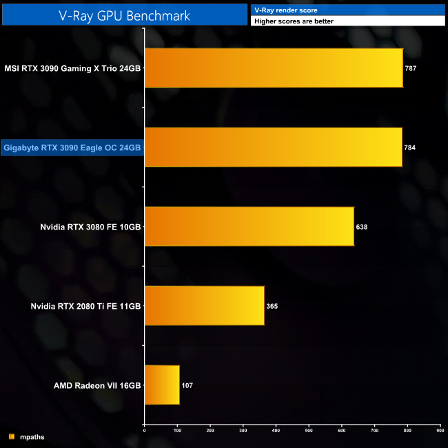 It is V-Ray where we see the single biggest performance improvement for the RTX 3090, relative to the RTX 3080. In this benchmark, RTX 3090 outperforms its smaller brother by 23%.
