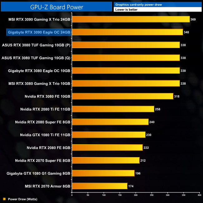 Looking at board power-only, we can see the RTX 3090 Eagle OC has a 350W power target. This is just 10W more than the RTX 3080 Eagle OC or RTX 3080 Gaming X Trio, and 30W higher than the RTX 3080 Founders Edition.