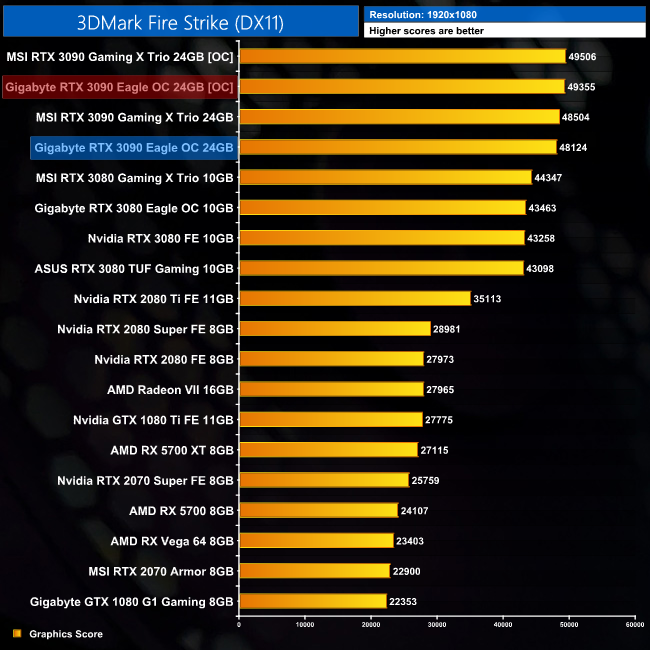 Finally we come to manual overclocking. We have already seen how Ampere is already pretty limited in this regard, and unfortunately this is no different for the RTX 3090. In fact, I could only add an extra 10MHz to the GPU core, as anything more resulted in crashes during 3DMark Time Spy. Thankfully, the GDDR6X was a bit more amenable to an overclock, and I could add 950MHz to the memory, bringing speeds up to 21.4Gbps.
