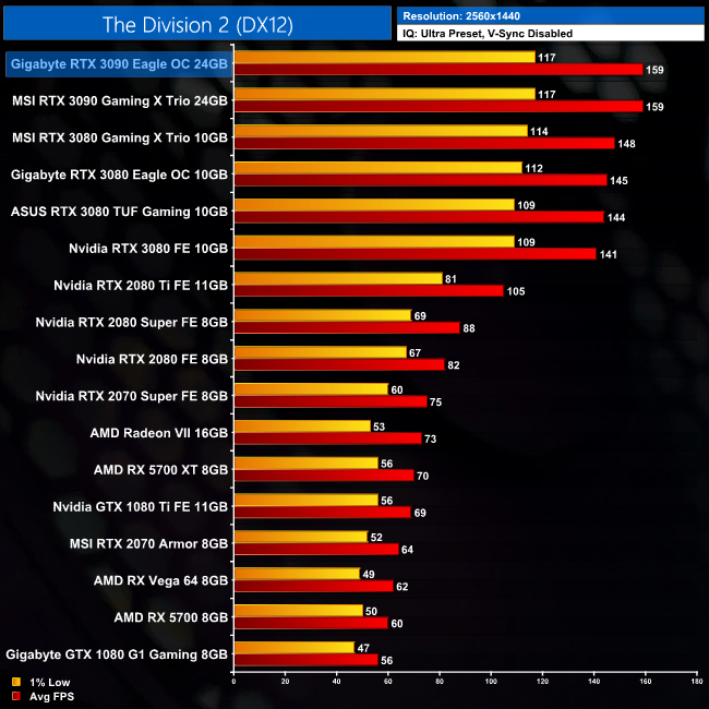 The Division 2 is a game that seems to like the Ampere architecture, and here we see the Gigabyte RTX 3090 beat the RTX 2080 Ti by a 56% margin at 4K. That makes it the single biggest increase over last generation's flagship that we will see today. Compared to RTX 3080, it's another 13% uplift for the 3090.