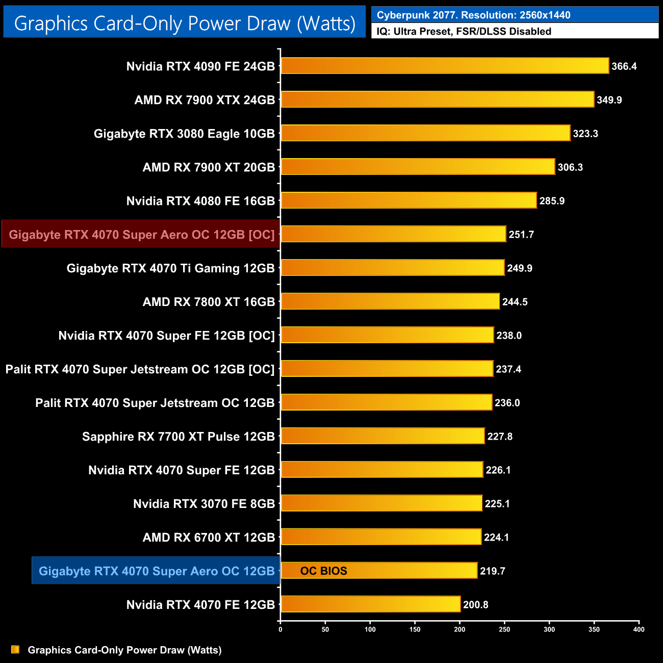 Power draw also rose a fair chunk with this overclock dialled in, reaching just over 250W, or a 15% increase over stock.