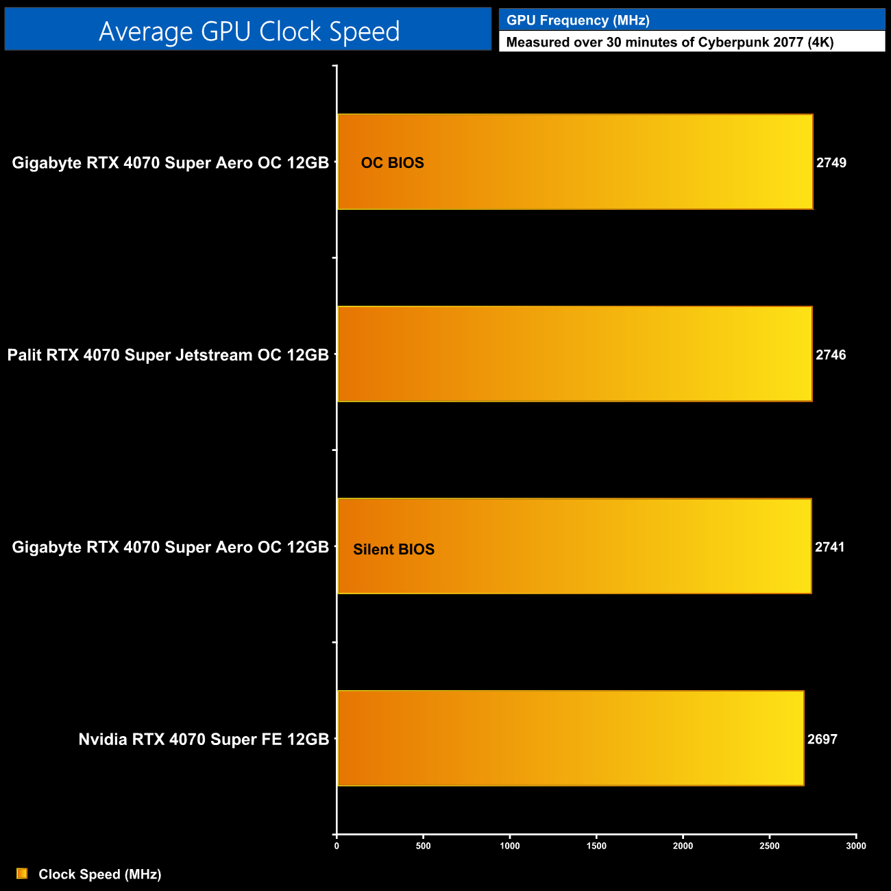 The Aero OC does enjoy a small performance advantage over Nvidia's Founders Edition thanks to slightly higher clock speeds, as it hovered around the 2750MHz mark during our testing. In fact, it averaged 2749MHz after a 30-minute stress test, so it's about 50MHz faster than the Founders Edition in the real world. Both the OC and Silent BIOS share the same clock speed and power target, so there is only a negligible 8MHz difference between their average clock speeds.