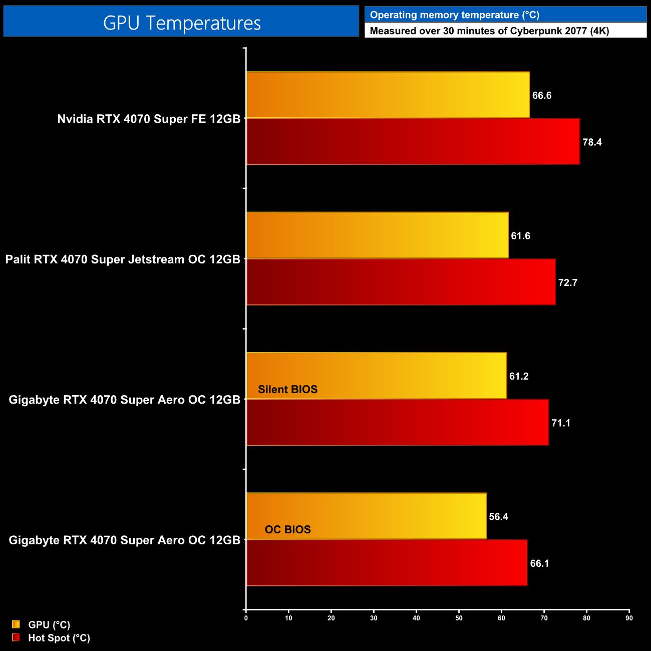For our temperature testing, we measure the peak GPU core temperature under load. A reading under load comes from running Cyberpunk 2077 for 30 minutes.