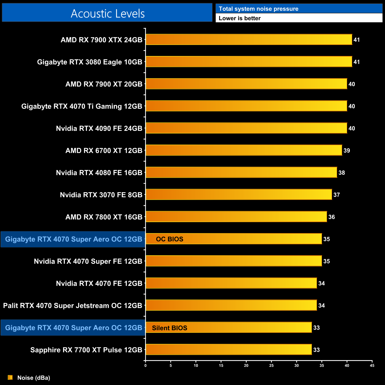 The Aero OC also impresses in terms of its noise levels. Of course, the Silent BIOS is the quietest mode, where the fans spin at just 1170rpm, producing 33dBa of noise. The OC BIOS sees fan speed increase to 1485rpm, but even that is still very easy on the ears, with noise levels hitting just 35dBa.