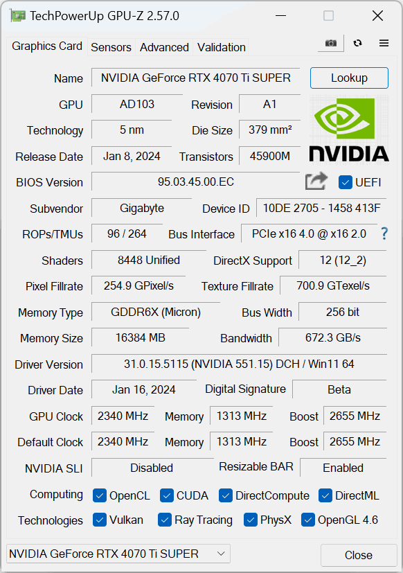 TSMC's N4 node has Nvidia cranking up the clock speed significantly this generation, with the RTX 4070 Ti Super sporting the same 2610MHz rated boost clock as the 4070 Ti. Gigabyte has increased this to 2655MHz with the Aero OC, but we would expect GPU Boost to push things further still.