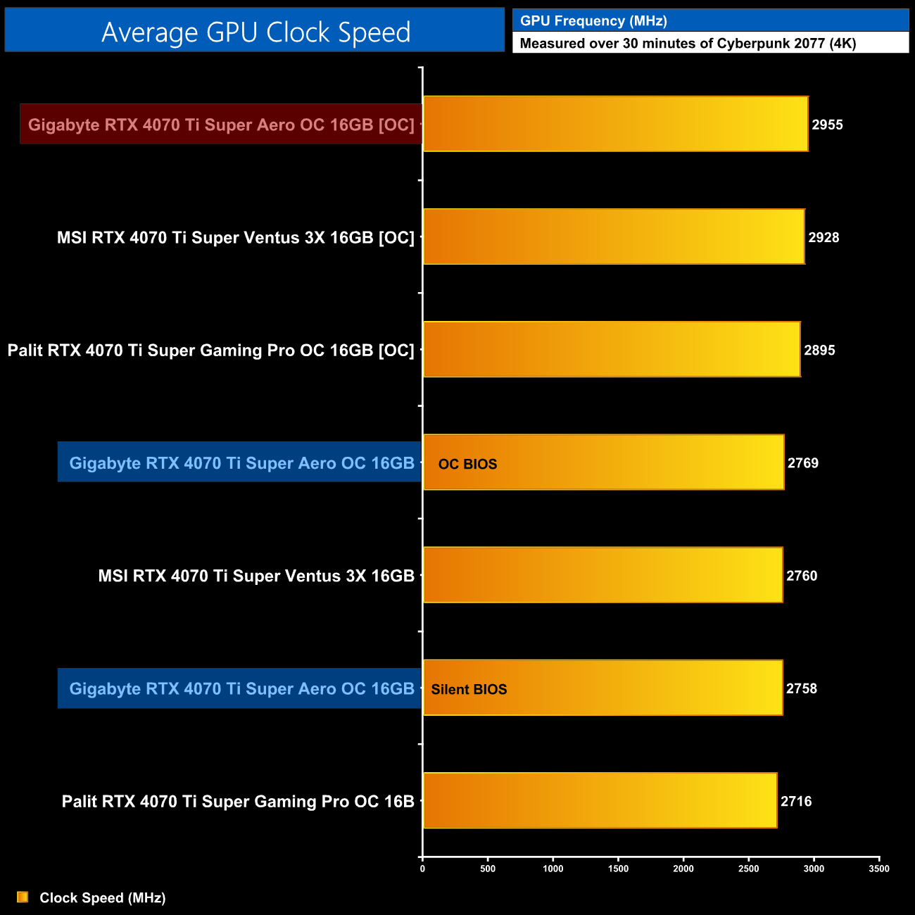 This resulted in the GPU averaging 2955MHz over our thirty-minute real-world stress test.