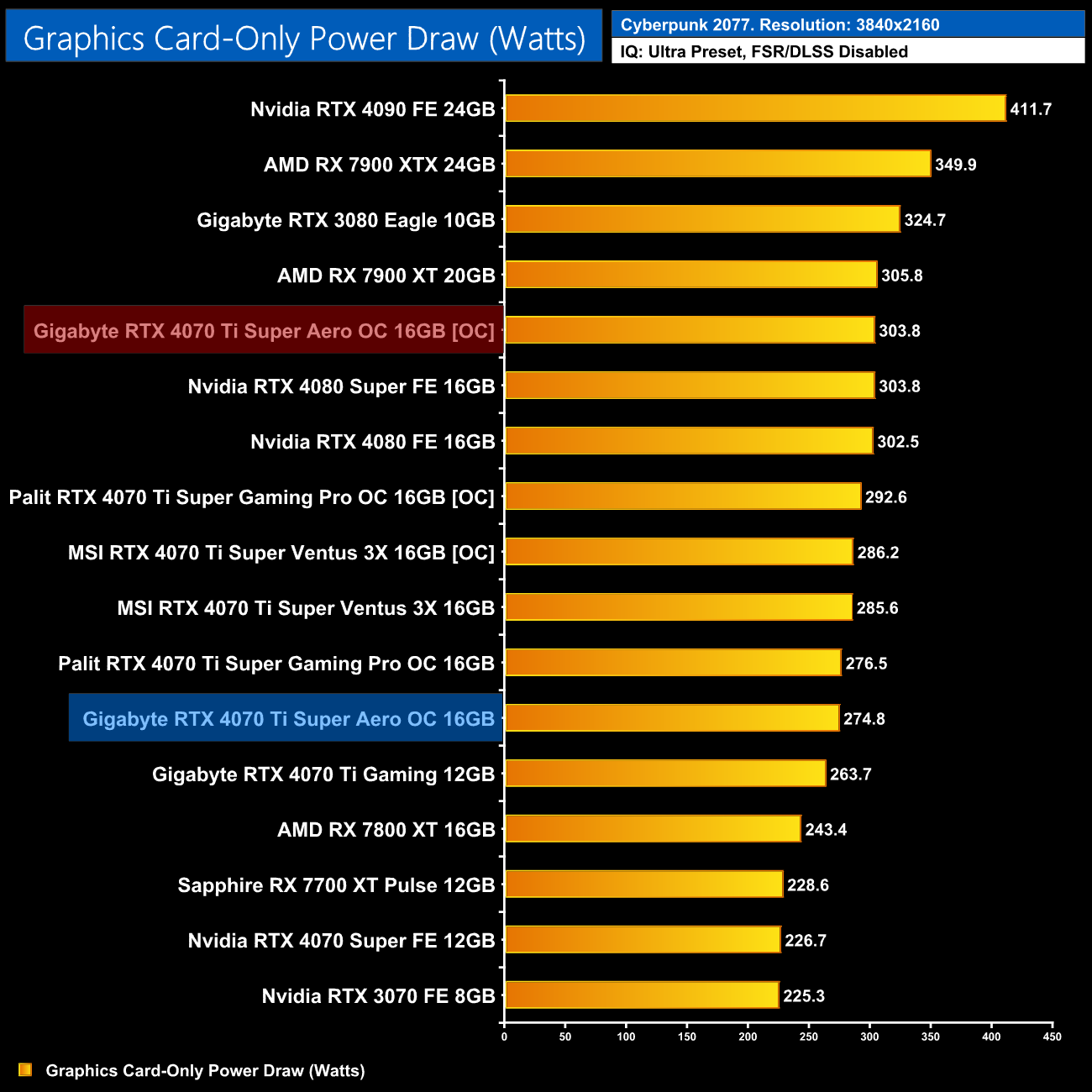 Power did rise by about 25W however, from 274.8W stock, to 303.8W when overclocked – that's an 11% increase.