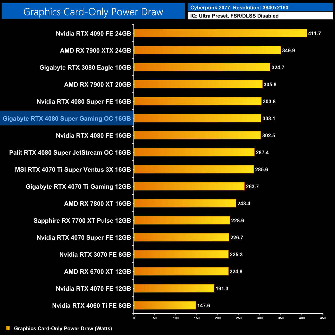We use Nvidia PCAT to measure power draw of the graphics card only, with readings from both the PCIe slot and the PCIe power cables combined into a single figure. We use Cyberpunk 2077 (1440p) for this testing.
