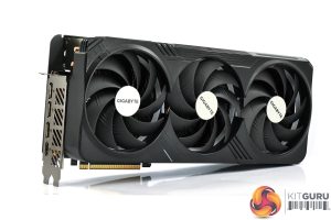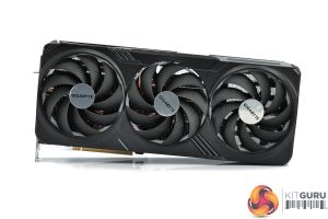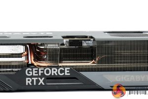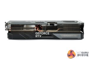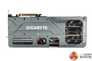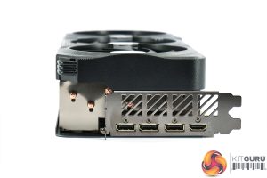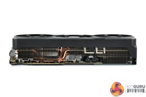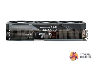 We can note the use of three 110mm fans, using Gigabyte's so-called ‘Unique Blade Fan' design. As expected from a Gigabyte card, the central fan spins in reverse relative to the others, which Gigabyte claims helps to reduce airflow turbulence and therefore increase air pressure down into the heatsink.