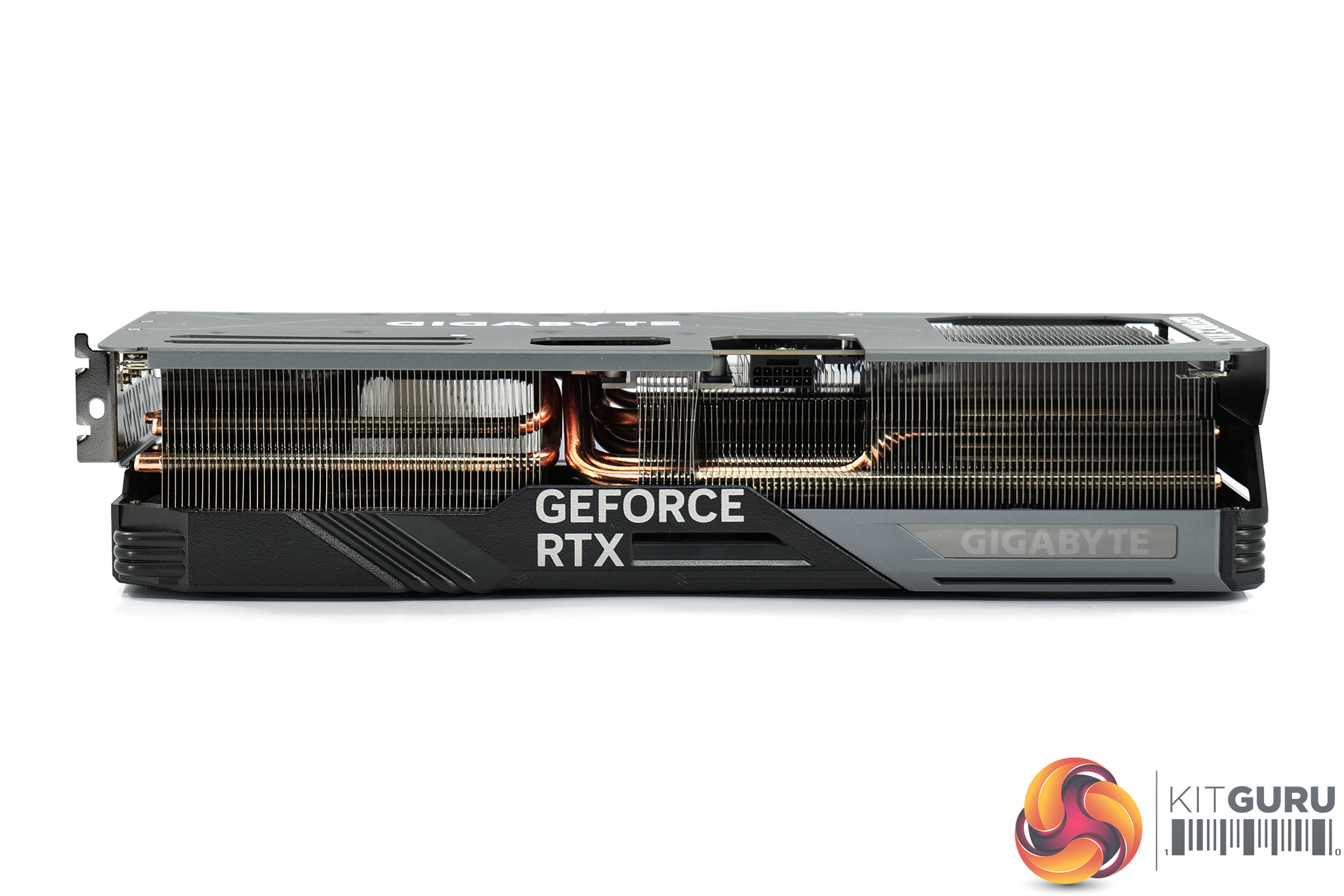 The front side of the card is home to the GeForce RTX branding, as well as the Gigabyte logo (one of the RGB zones on the card).