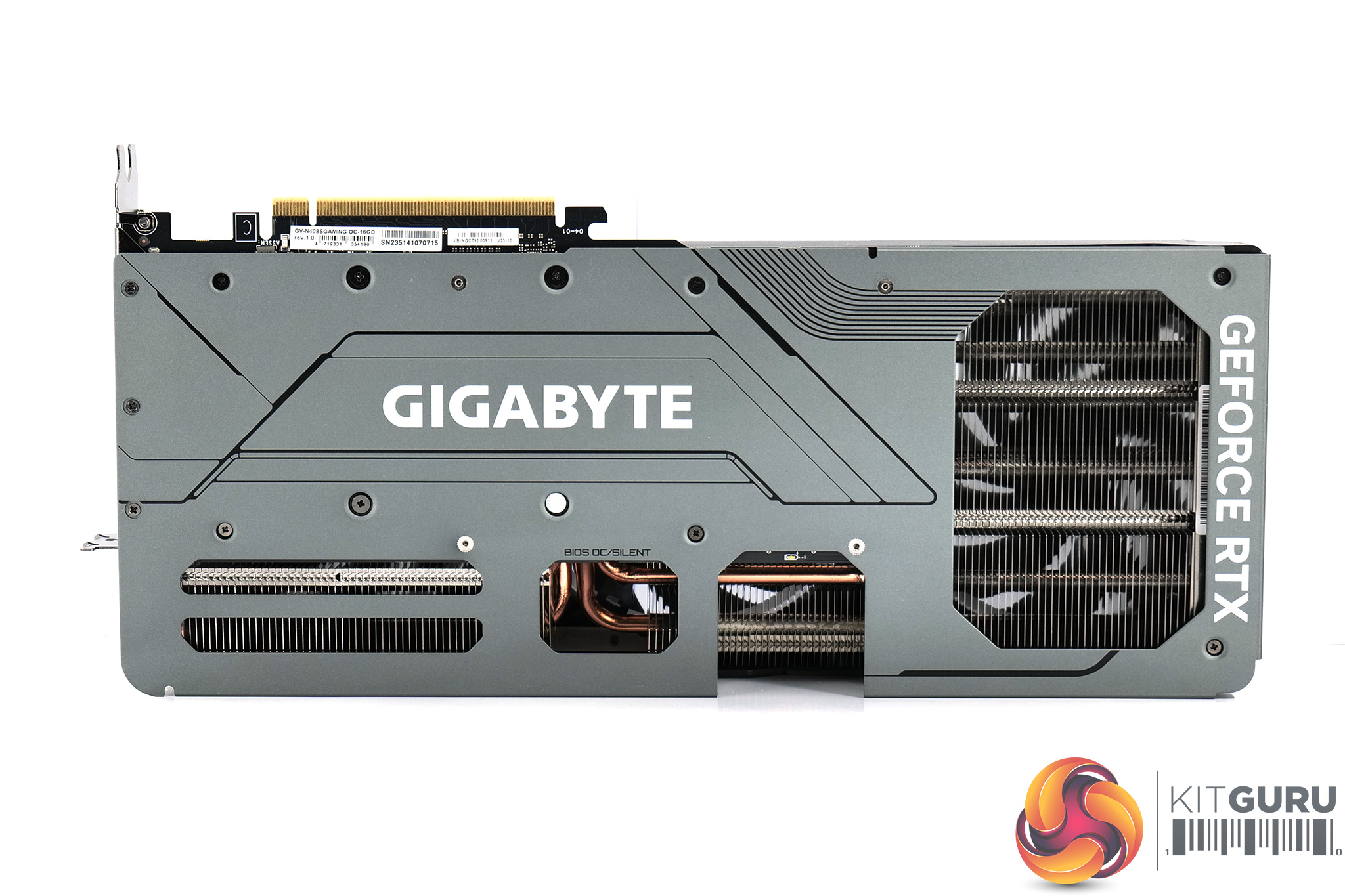 As for the backplate, this is made from metal and while it is a full-length design, there is a large cut-out towards the end of the card to allow airflow to pass directly through the heatsink. We can also note the dual-BIOS switch position in the middle, offering a choice of the OC or Silent modes. Both are identical in terms of the 2595MHz clock speed and 320W power limit, with only the fan curve separating the two.