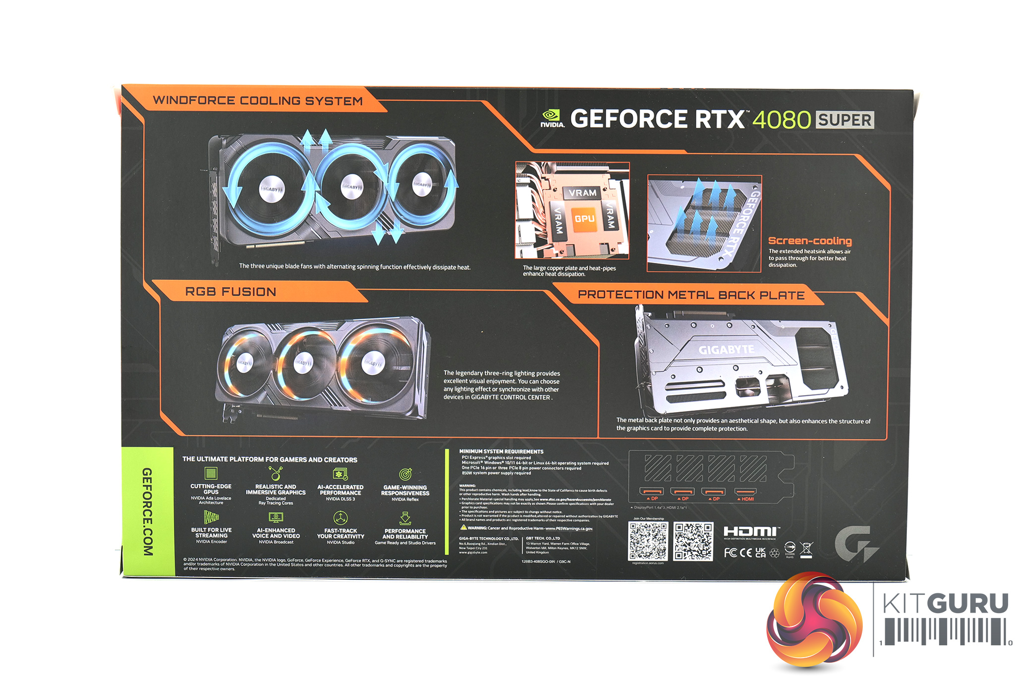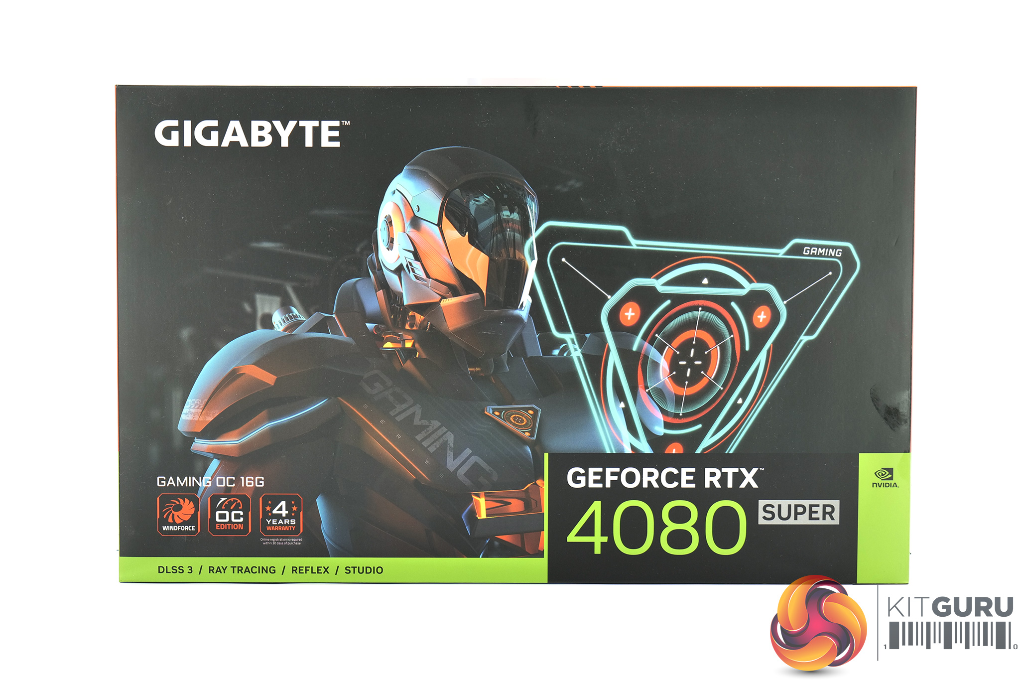 The Gigabyte RTX 4080 Super ships in a large black box, with a RoboCop style figure visible on the front. On the back, Gigabyte highlights a few key features of the Gaming OC and its Windforce 3X cooler.