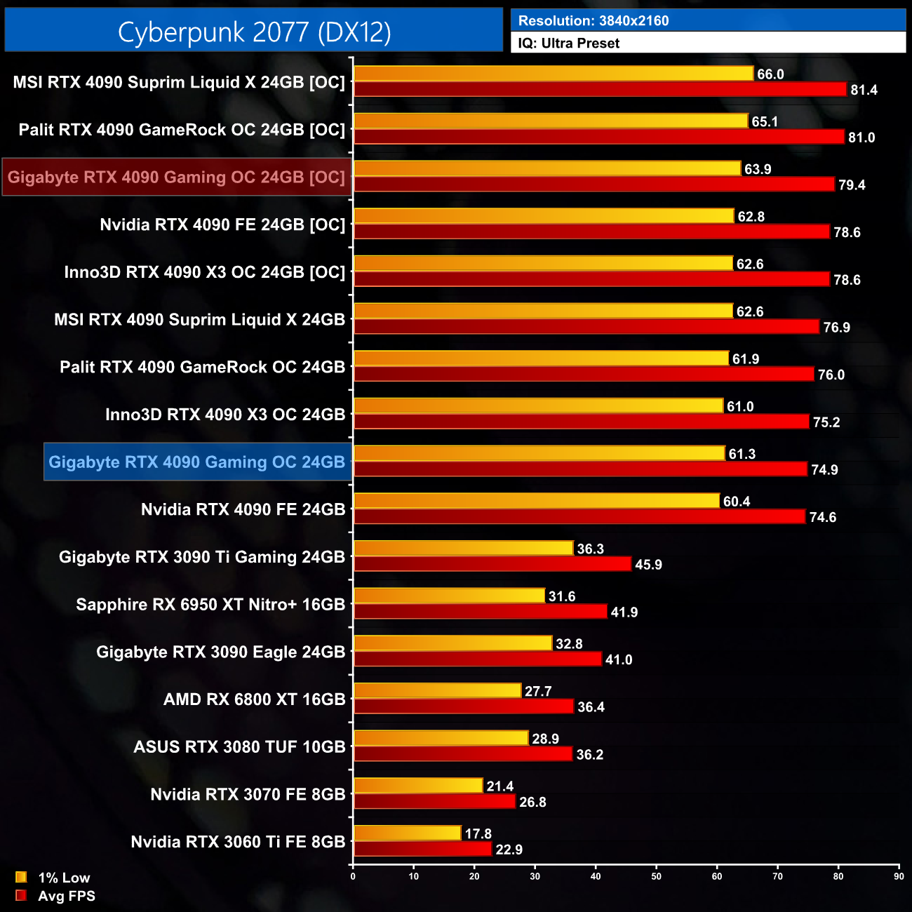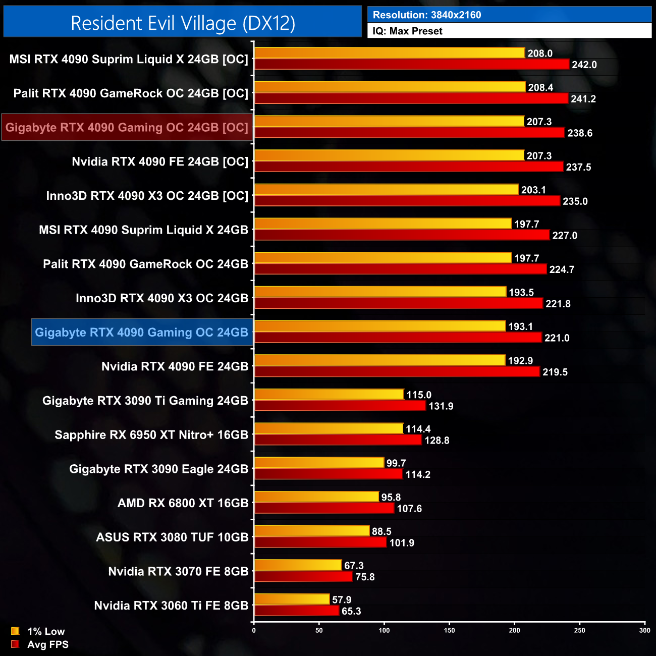 The extra frequency brought gains of 6% in Cyberpunk, but then 8% in Spider-Man Remastered and Resident Evil Village, so the Gaming OC was just out-performing the Founders Edition when overclocked, but only by a fraction.