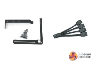 We get three quick-start and warranty guides, as well as a quad 8-pin power adapter. Most interesting is the included GPU support bracket, which actually screws into two motherboard standoffs to prevent any GPU sag.
