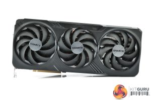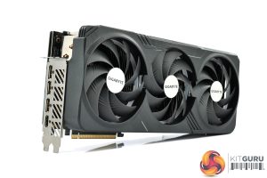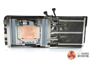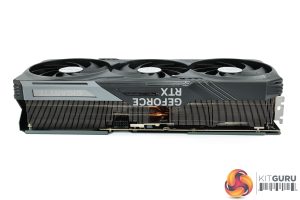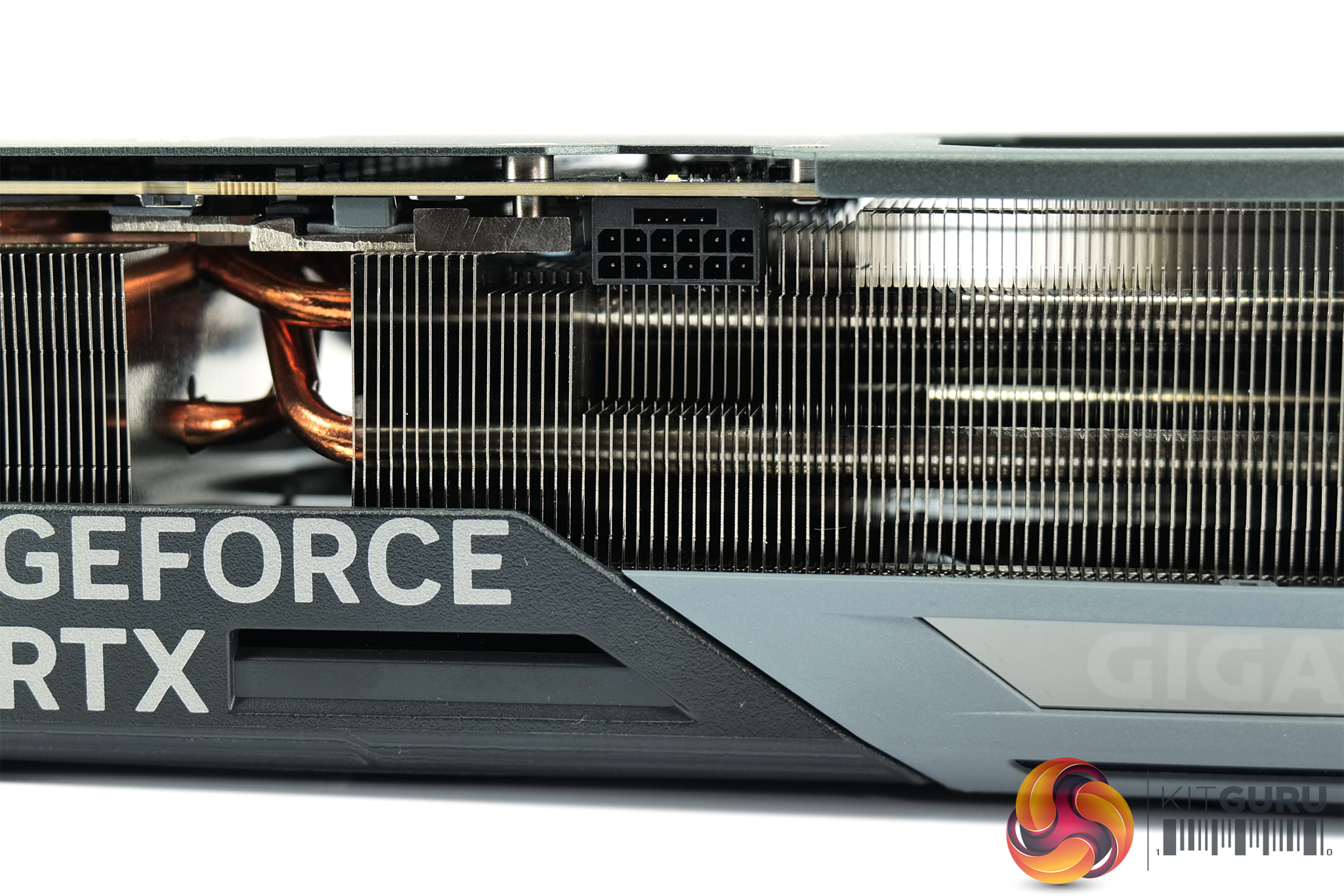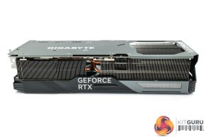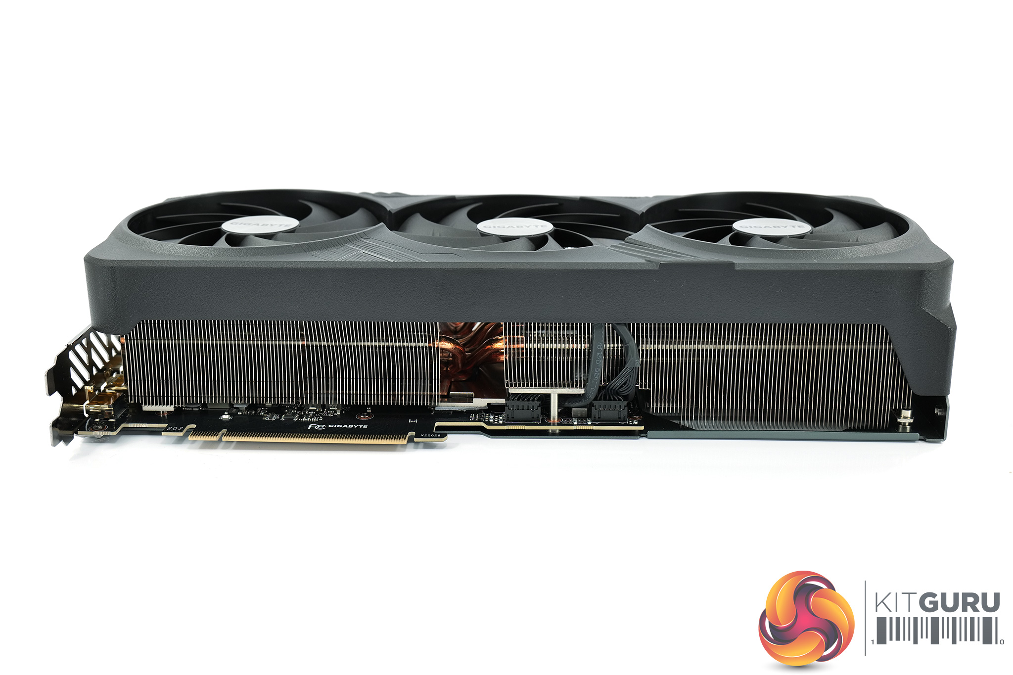 We can note the use of three 110mm fans, using Gigabyte's so-called ‘Unique Blade Fan' design. As expected from a Gigabyte card, the central fan spins in reverse relative to the others, which Gigabyte claims helps to reduce airflow turbulence and therefore increase air pressure down into the heatsink.