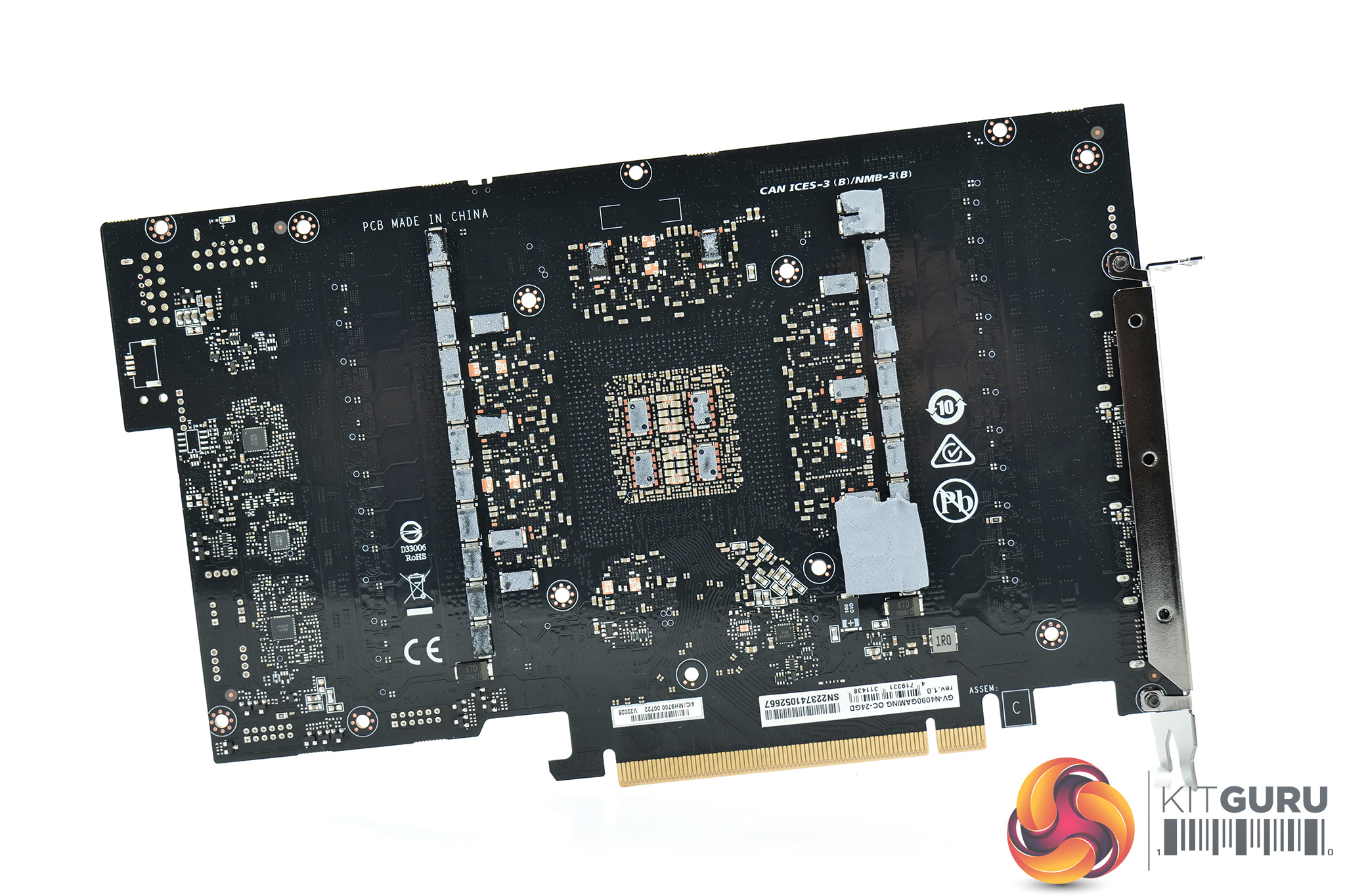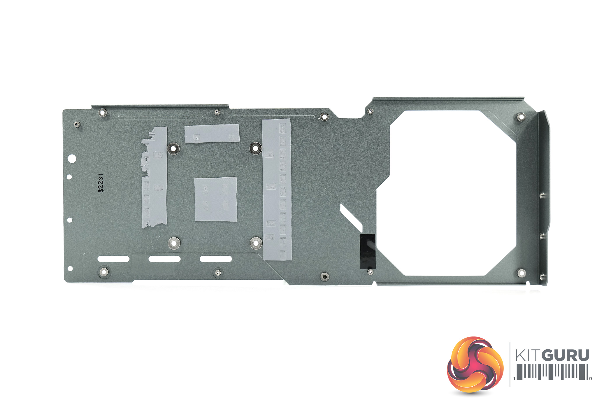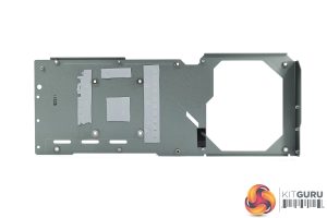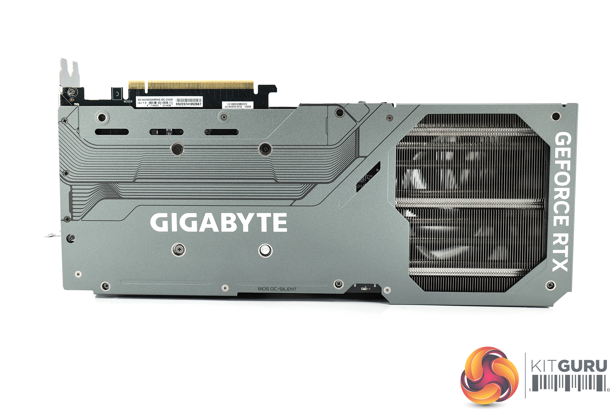 As for the backplate, this is made from metal and while it is a full-length design, there is a large cut-out towards the end of the card to allow airflow to pass directly through the heatsink. We can also note the dual-BIOS switch position in the middle, offering a choice of the OC or Silent modes. Both are identical in terms of clock speed and power limits, with the fan curve being the only difference.