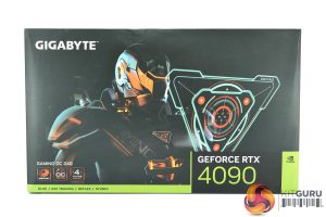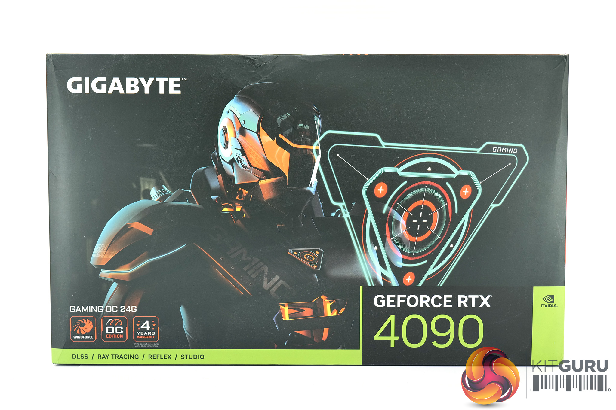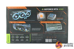 The Gigabyte RTX 4090 Gaming OC arrives in a large black box, with a RoboCop-style avatar depicted on the front. On the back, Gigabyte highlights a few key features of the design and the cooler.