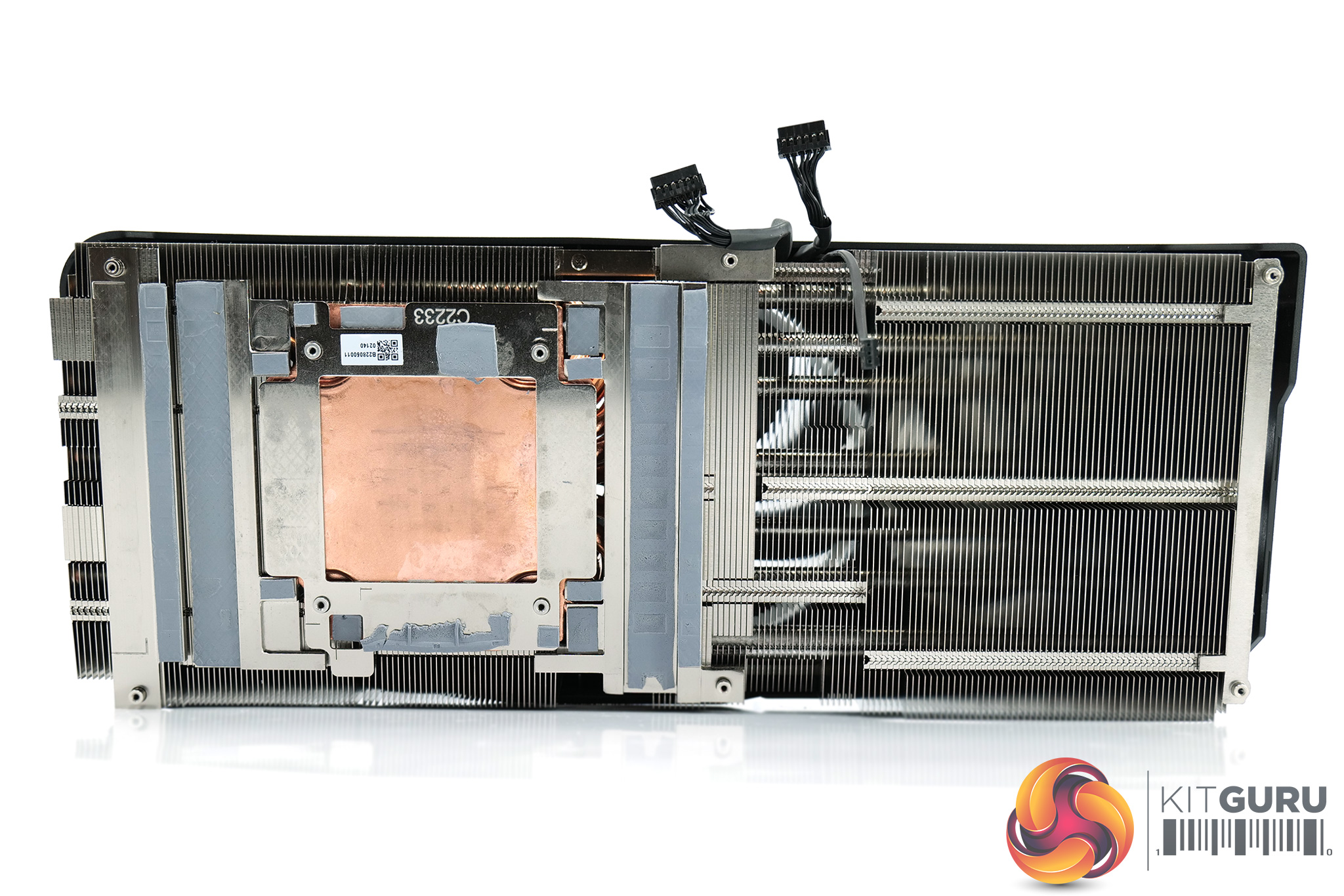 In terms of the cooler, Gigabyte is using a vapour chamber that contacts with the GPU die via a copper baseplate, sitting above 10x 6mm copper heatpipes. Numerous thermal pads are visible that contact with the memory modules and VRM via aluminium baseplates, which sit on-top of the huge aluminium fin stack.