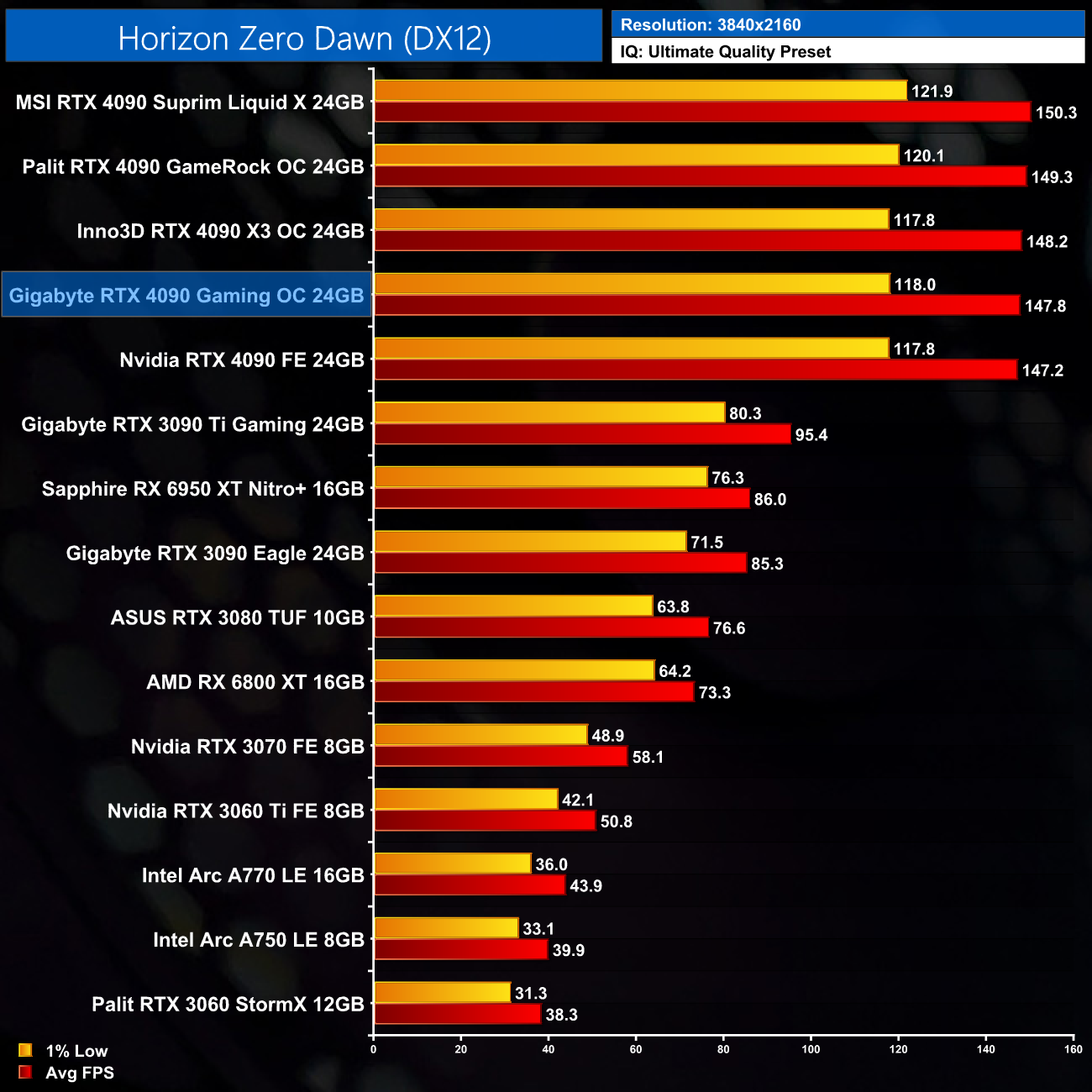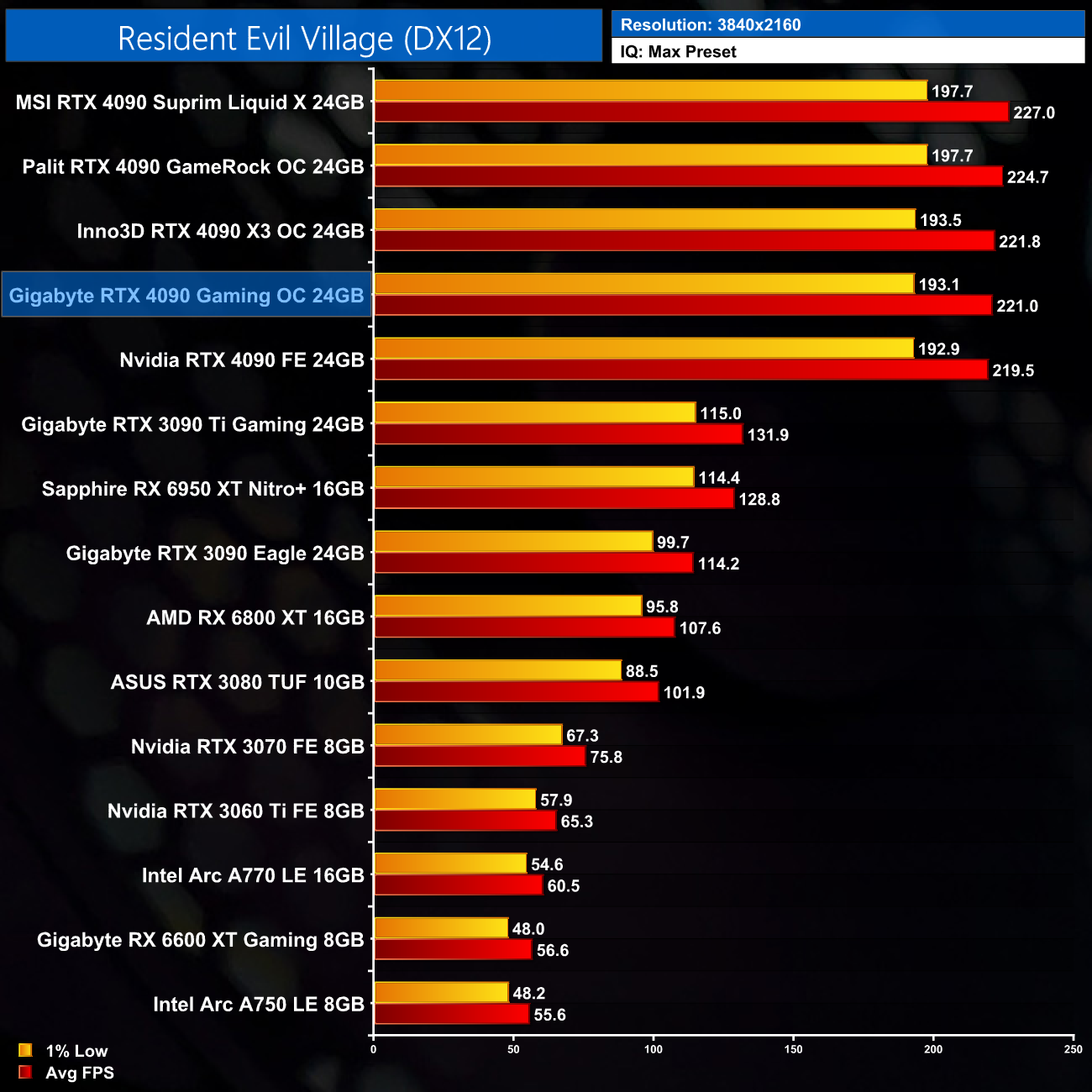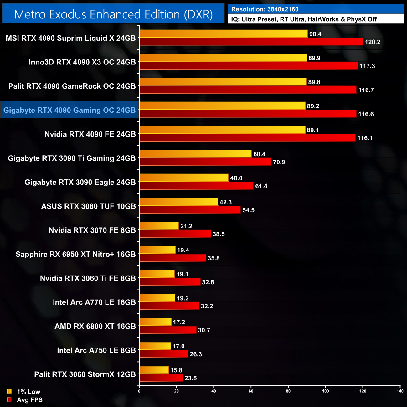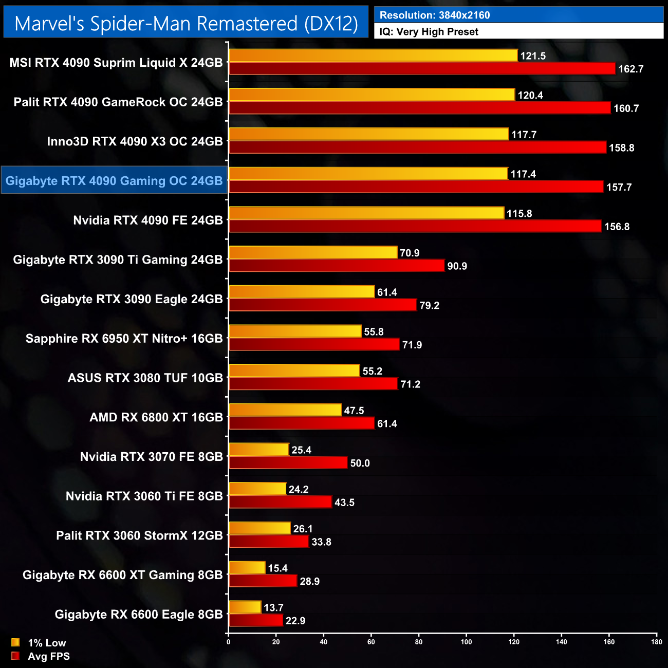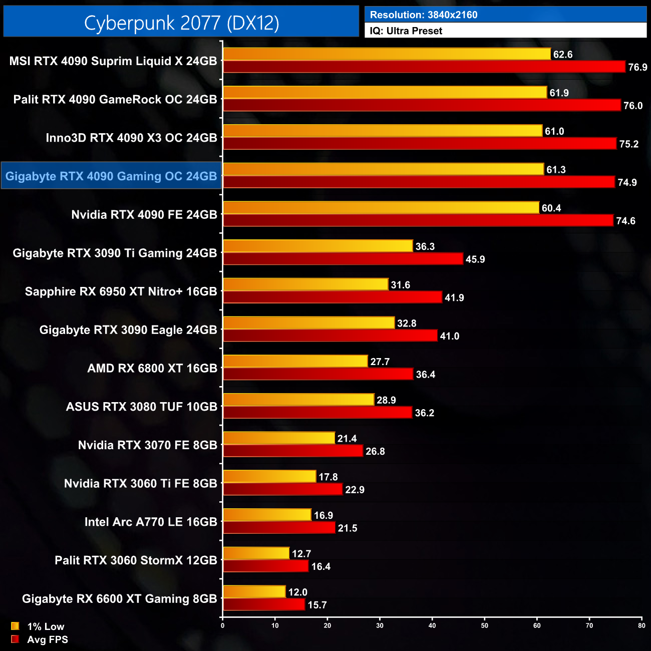 As expected, our game benchmarks show the Gaming OC delivers near identical performance to the Founders Edition. In fact, the Gaming OC was never more than 1% faster than the Founders Edition across all five games tested, so the performance really is functionally identical. That's no bad thing though – it is still an RTX 4090, just don't expect any meaningful difference versus the Founders.