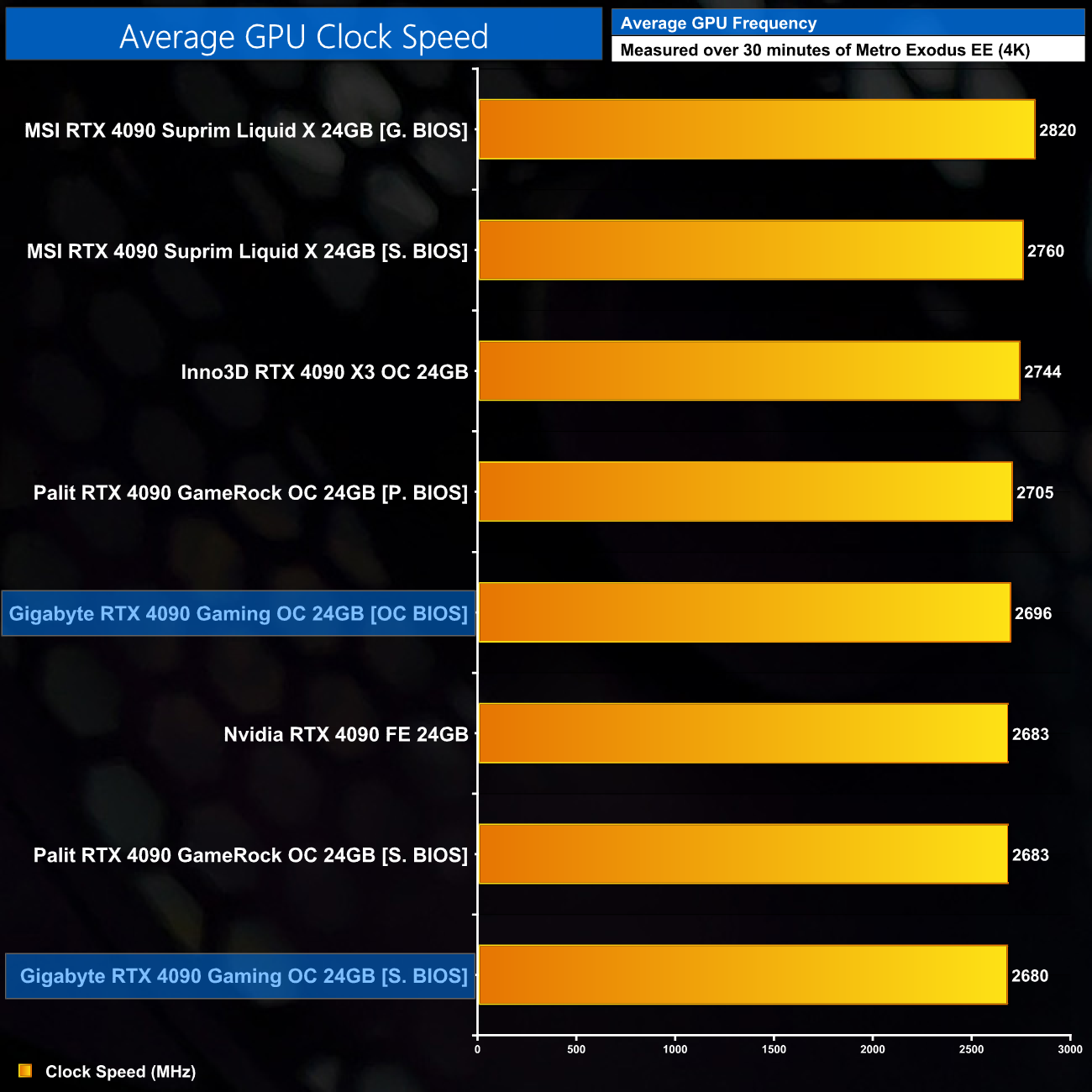The reason we see such little difference in gaming performance is because the Gaming OC doesn't boost much higher than the Founders Edition at all. Over our thirty-minute stress test, it averaged 2696MHz using the default OC BIOS, and that's just a 13MHz gain over the Founders.