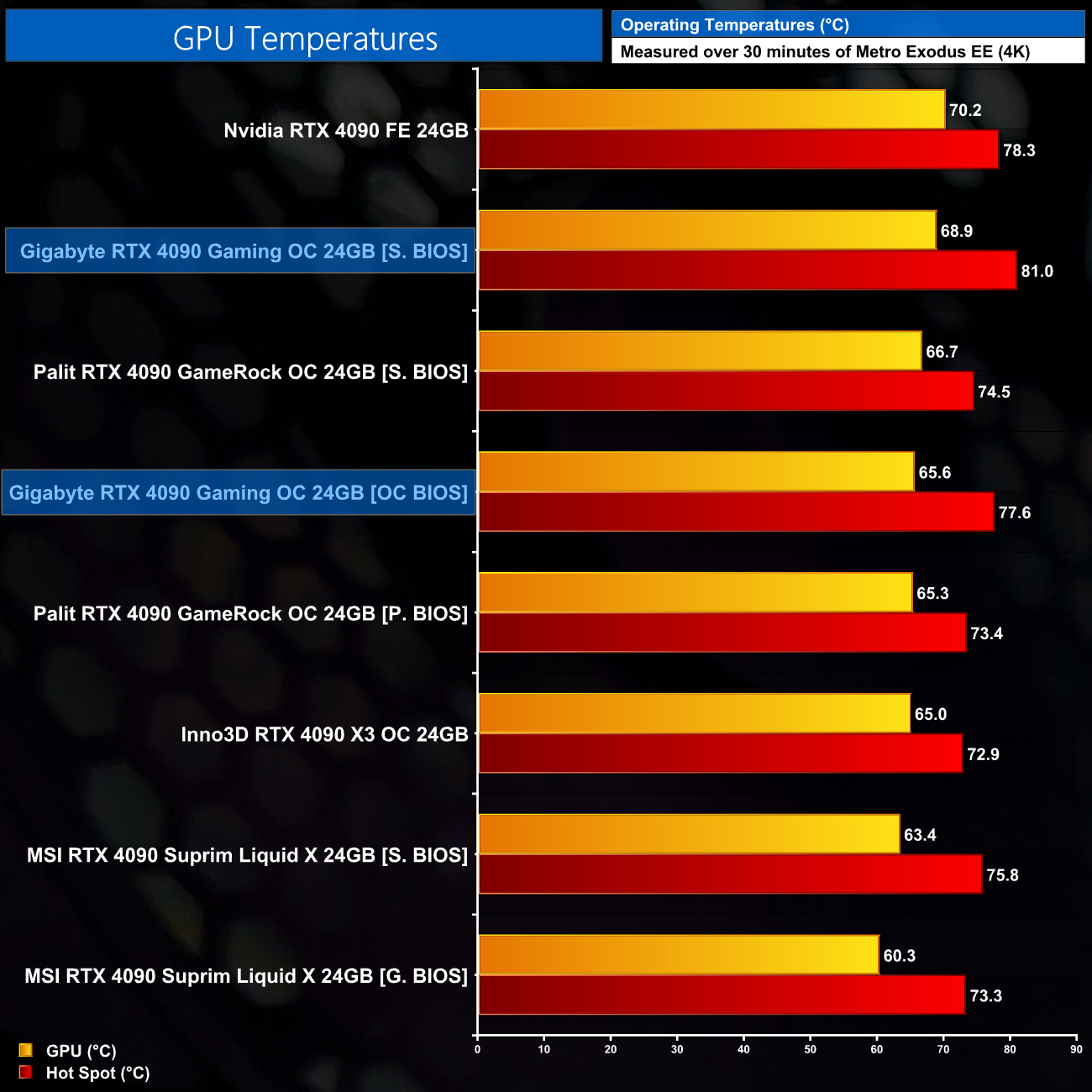 For our temperature testing, we measure the peak GPU core temperature under load. A reading under load comes from running Metro Exodus Enhanced Edition for 30 minutes.