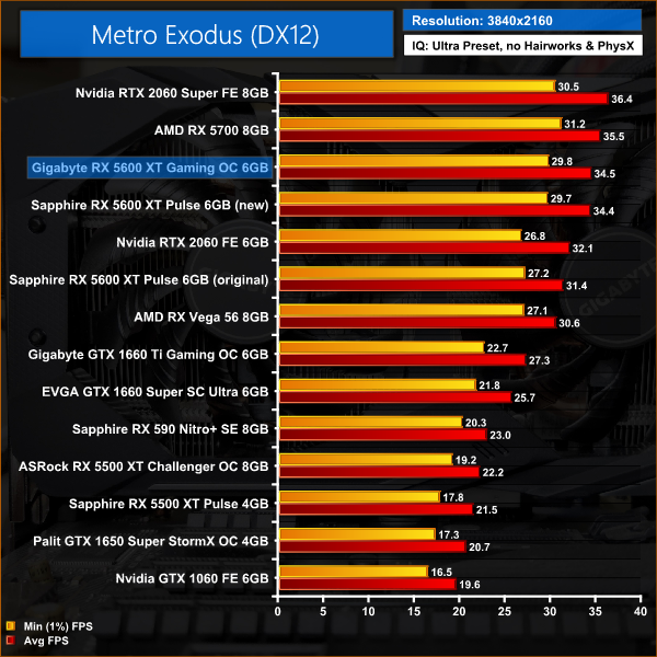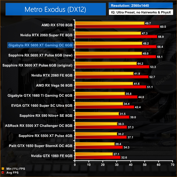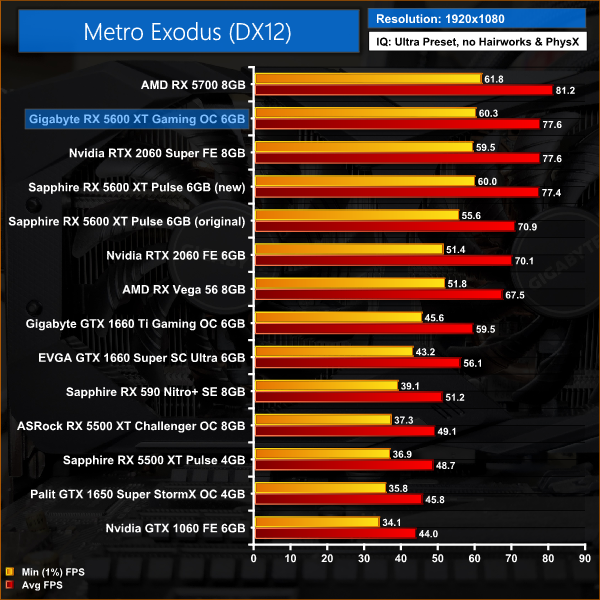 Metro Exodus swings things back the other way, with an impressive 11% performance advantage for the Gigabyte 5600 XT compared to the RTX 2060 when testing at 1080p. Once more, the overall difference between the Gaming OC and the Pulse is less than a single frame at every resolution tested.