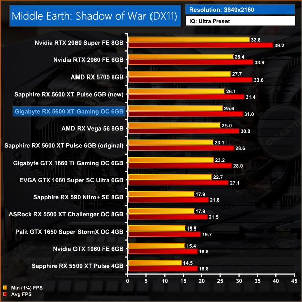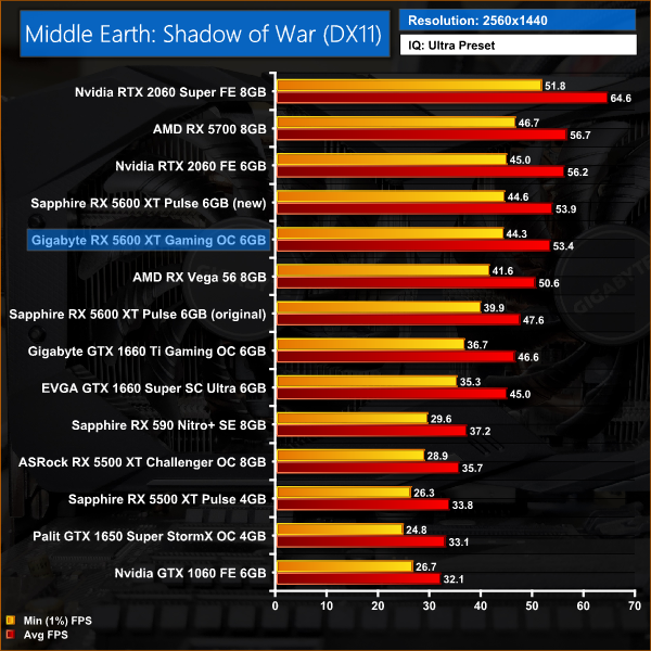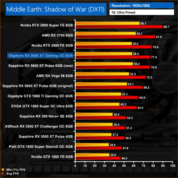 Middle Earth: Shadow of War definitely favours Nvidia graphics cards, and here we can see the RTX 2060 outperforming the 5600 XT Gaming OC at every resolution. The gap is only 2% at 1080p, but stretches to 5% at 1440p. Compared to the 2060 Super, the 5600 XT is 14% slower at 1080p, and 17% slower at 1440p.