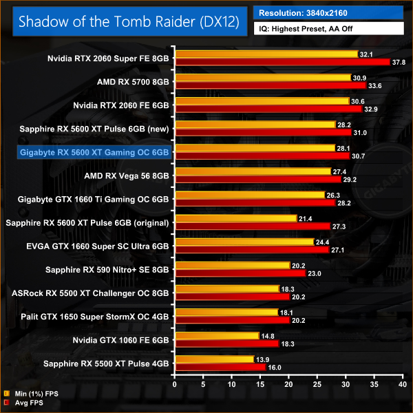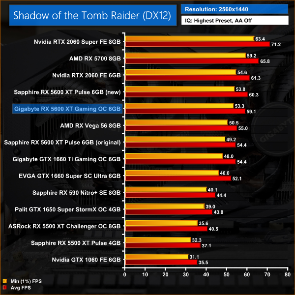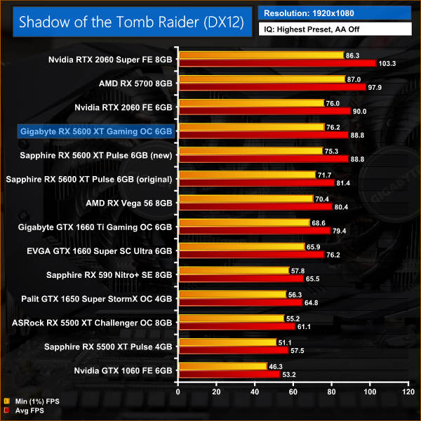 Shadow of the Tomb Raider once more has the 5600 XT slower than the RTX 2060 at every resolution tested – only by 1% at 1080p, but this moves to 4% as we increase the resolution to 1440p. The 5600 XT is also 14% and 17% slower than the 2060 Super, at 1080p and 1440p respectively.
