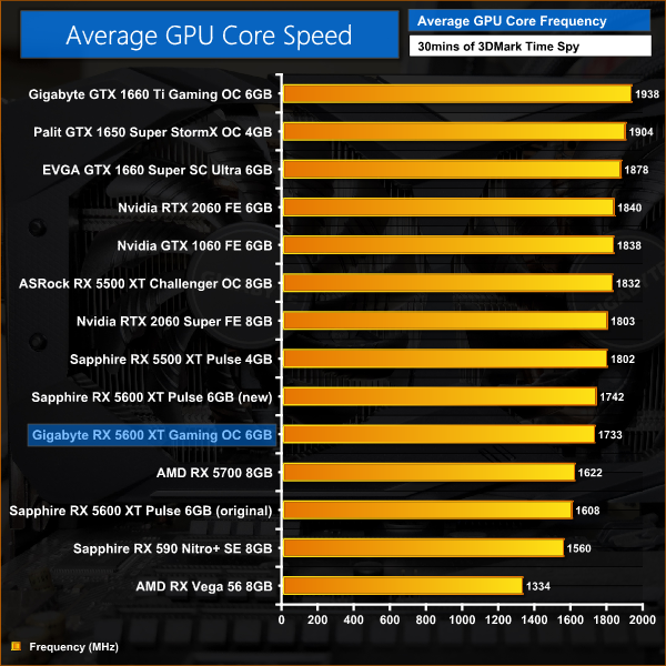 Throughout all of the games we tested today, we saw virtually no difference between the performance of this Gigabyte Gaming OC 5600 XT, and Sapphire RX 5600 XT Pulse. Our clock speed testing confirms why that is, as there is just a 9MHz speed gap separating these two cards based on our 30-minute stress test.