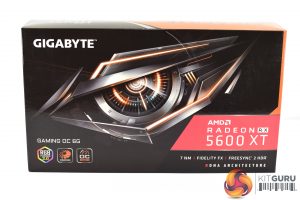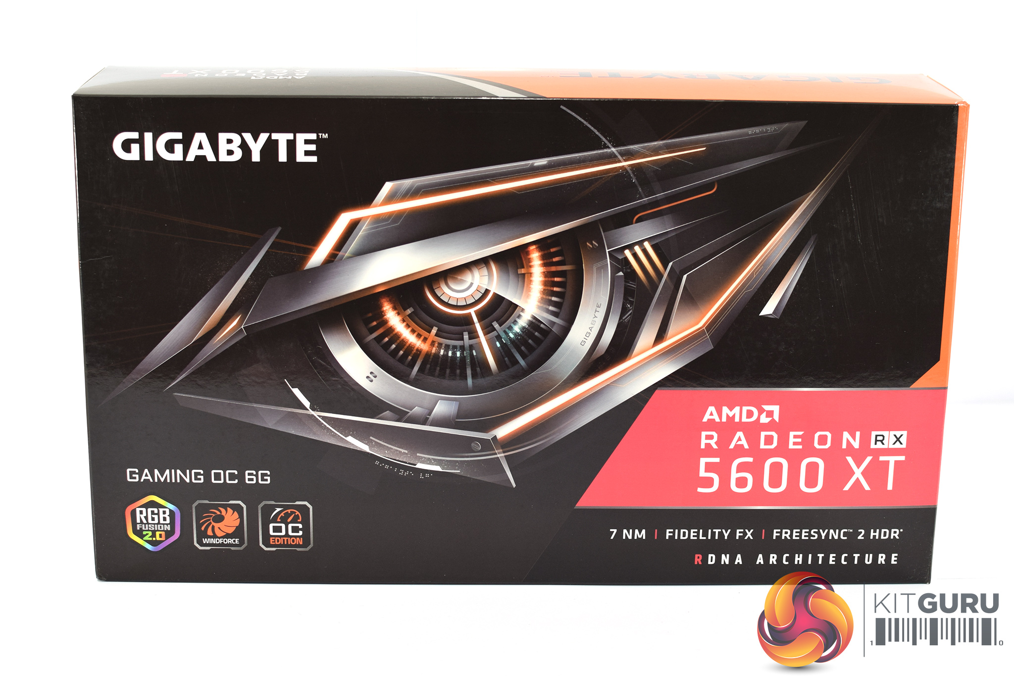 The Gigabyte RX 5600 XT Gaming OC 6G ships in a black box, with Gigabyte's large robotic eye logo dominating the front.