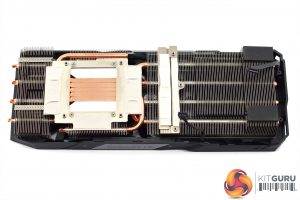 Finally, as for the cooler, this is comprised of three fin stacks, connected by a total of 5x 6mm copper heatpipes. These pipes make direct contact with the GPU die, while there is a separate plate for the VRAM and another for the VRM as well.