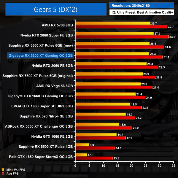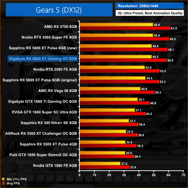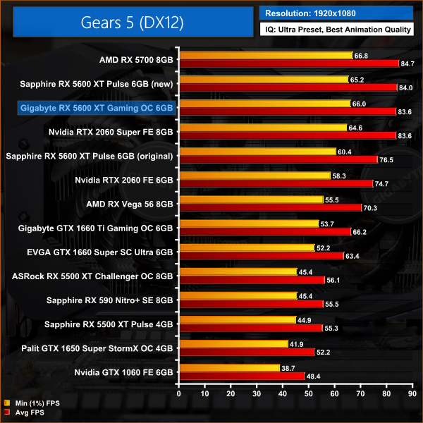 Gears 5 is an AMD title and at 1080p we see a 12% performance advantage for the Gigabyte Gaming OC versus the RTX 2060. This puts performance of the 5600 XT on par with that of the 2060 Super.