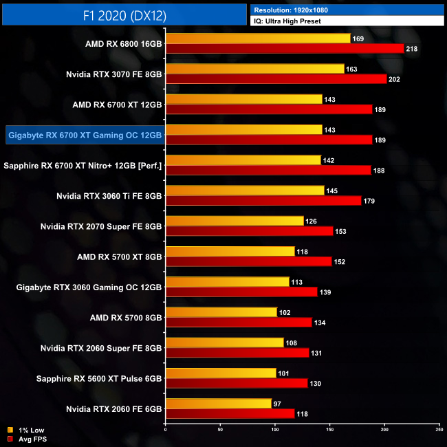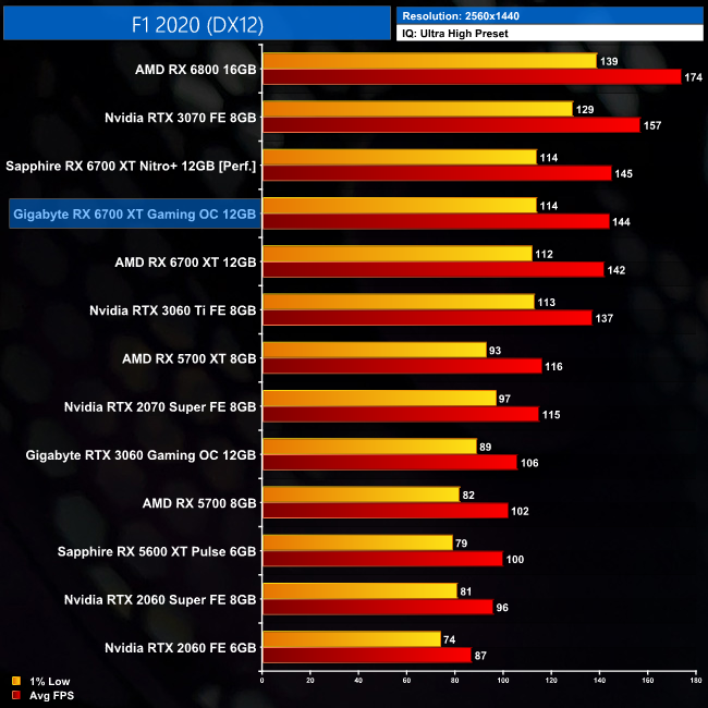 Meanwhile, F1 2020 is another game where all three RX 6700 XTs perform within a single percent of each other, which is a difference of just 2FPS on average at 1440p.