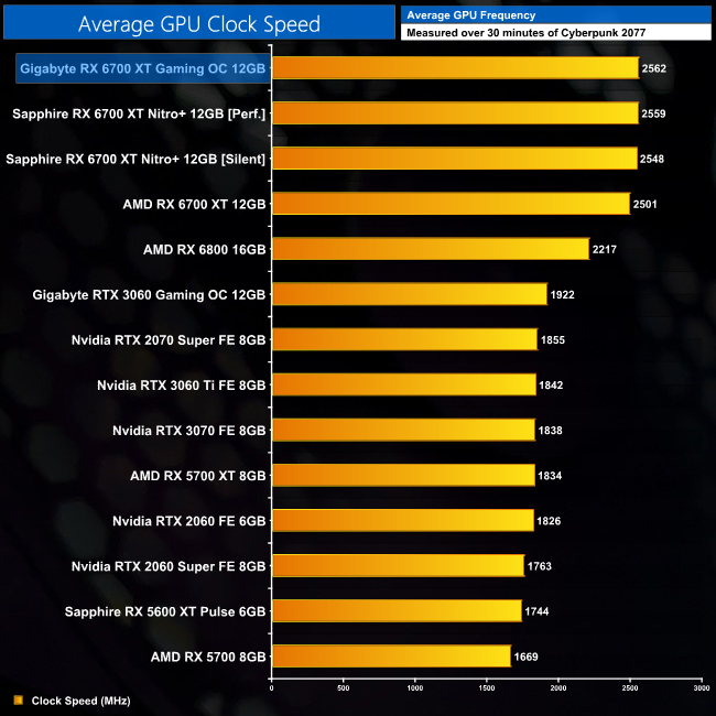 Here we present the average clock speed for each graphics card while running Cyberpunk 2077 for 30 minutes. We use GPU-Z to record the GPU core frequency during gameplay. We calculate the average core frequency during the 30 minute run to present here.