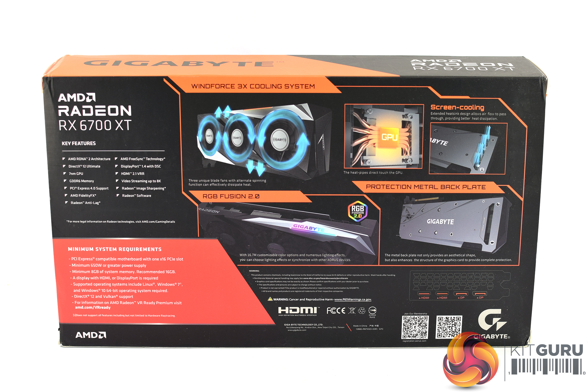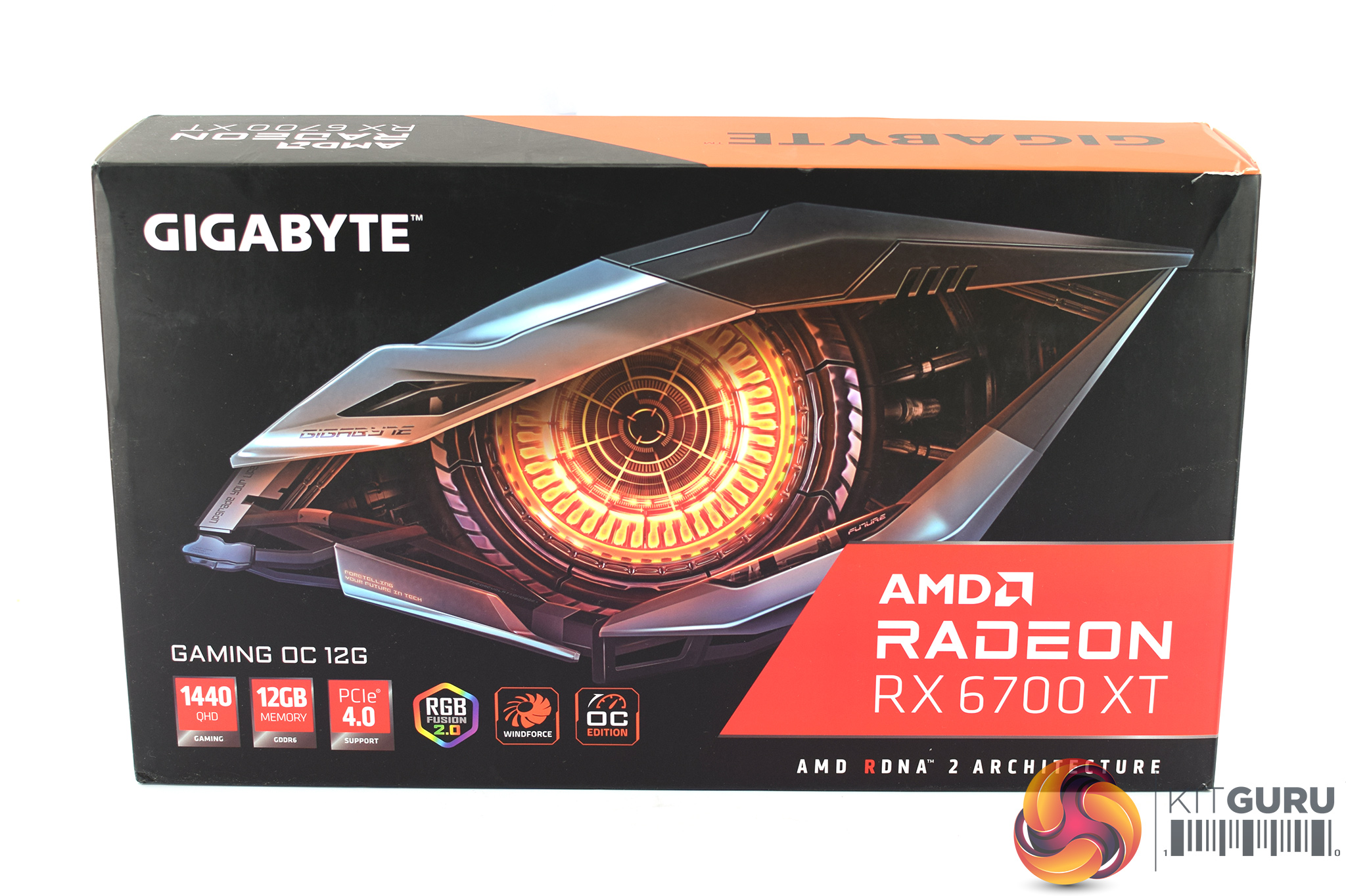 The Gigabyte RX 6700 XT Gaming OC arrives in a black box, adorned with Gigabyte's robotic eye logo on the front. On the back, various key features of the graphics card are highlighted, including the triple fan setup and direct touch heatpipes.
