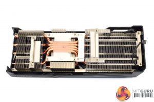 The heatsink is comprised of three fin stacks, connected by a total of 5x 6mm copper heatpipes. Unlike the RX 6900 XT Gaming OC, which uses a copper baseplate, here the heatpipes make direct contact with the GPU die. We can also see a variety of secondary plates used to contact the VRM and memory via thermal pads.